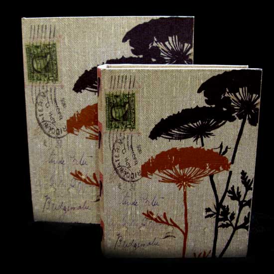 The book boxes constructed with wood and canvas feature an engaging postcard design. They are decorated with colored tree shades and stamps covered with realistic postmarks. These boxes also promise reliable protection for your favorite books.