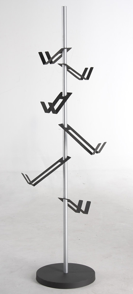 Pictured here is a book display rack that has been constructed in high quality metal. It boasts a unique and innovative design that uses gravity to hold the bookend-like holders in place. Simple and versatile, it will make a great display rack and storage unit for books, magazines, leaflets and so on.