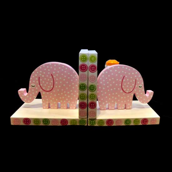This presented bookend set features a lovely L-shaped design. Each bookend comes with button-patterned rims and a cute elephant ornament for added style. This displayed bookend set is great for complementing your desk.