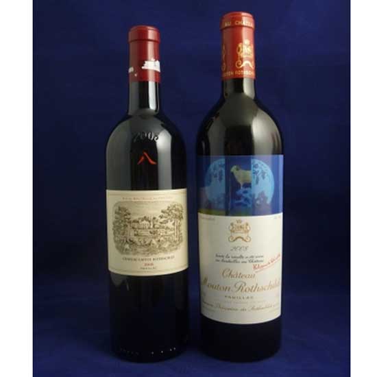 Shown here are two bottles of Bordeaux Grand Cru Classe produced in 2008. The full-bodied wines feature the aroma of smoke, tobacco, coffee, black berry and jam. Polished, supple and opulent in texture, the red wines end with a long pure finish.