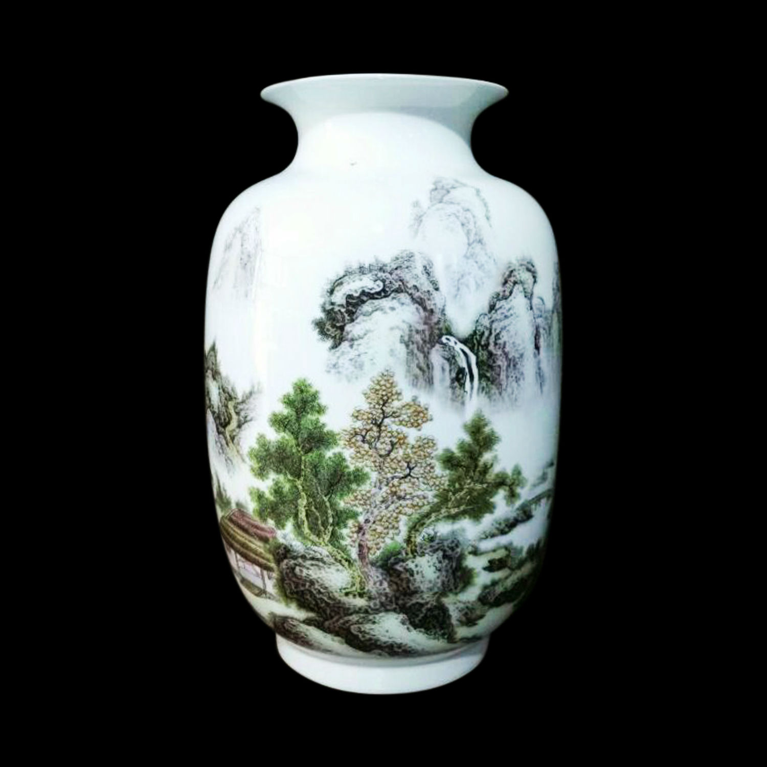 - Drawings on the vase accentuating poetic Asian natural scenery.