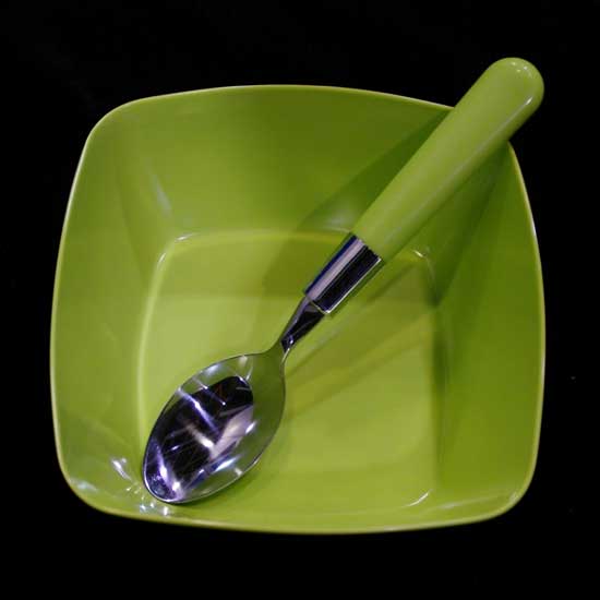 Displayed is a bowl and fork set that is made of strong and durable acrylic plastic material. Boasting a natural green color, this excellent set is a fine addition to your home. Look no further for the ideal addition to your tableware collection.