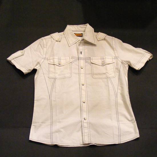 • The men's shirt has five buttons in the middle and two pockets on its front side.
