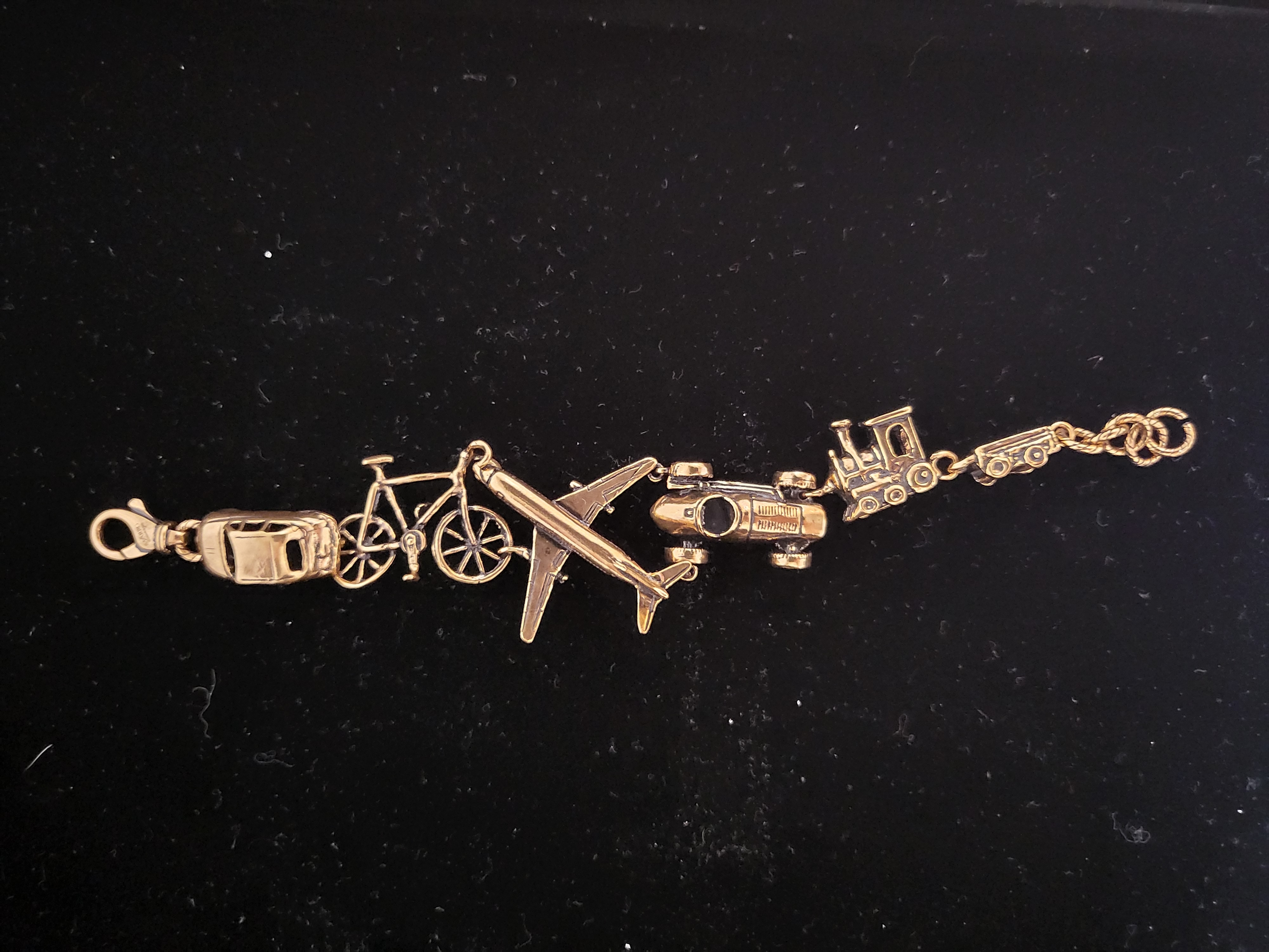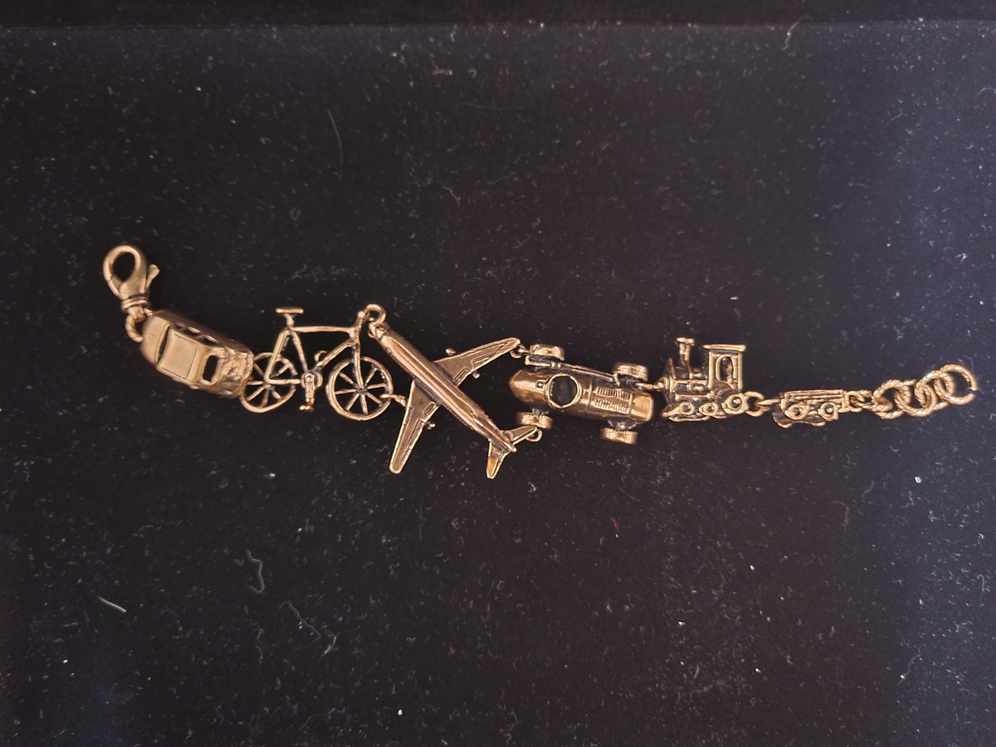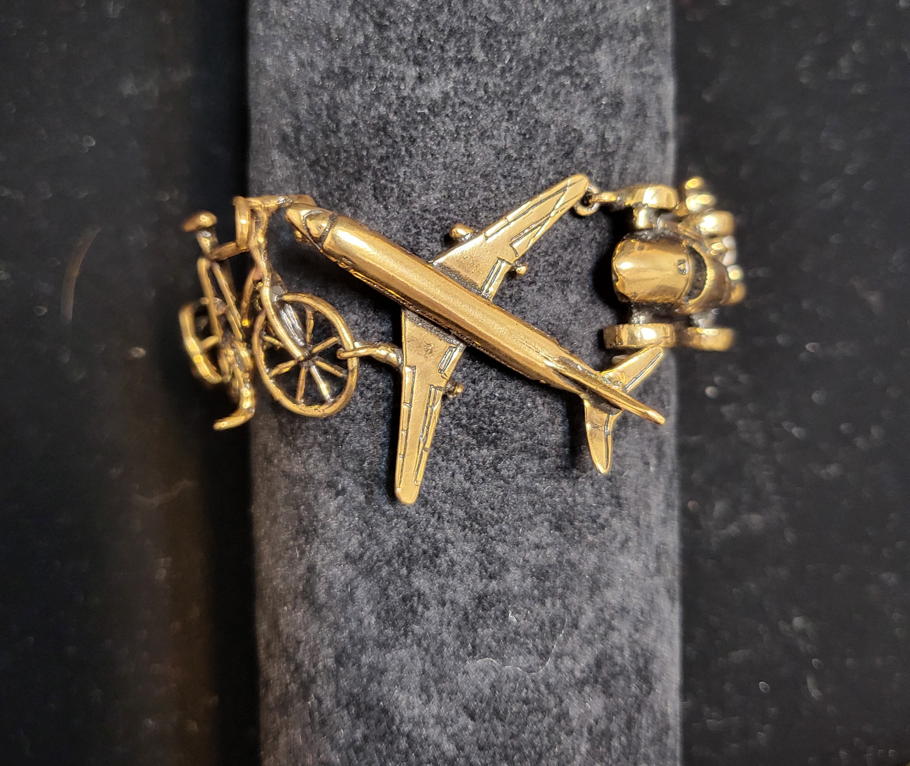 Unique design in semi-rigid bracelet in golden brass with car, bike, plane and train miniatures.
