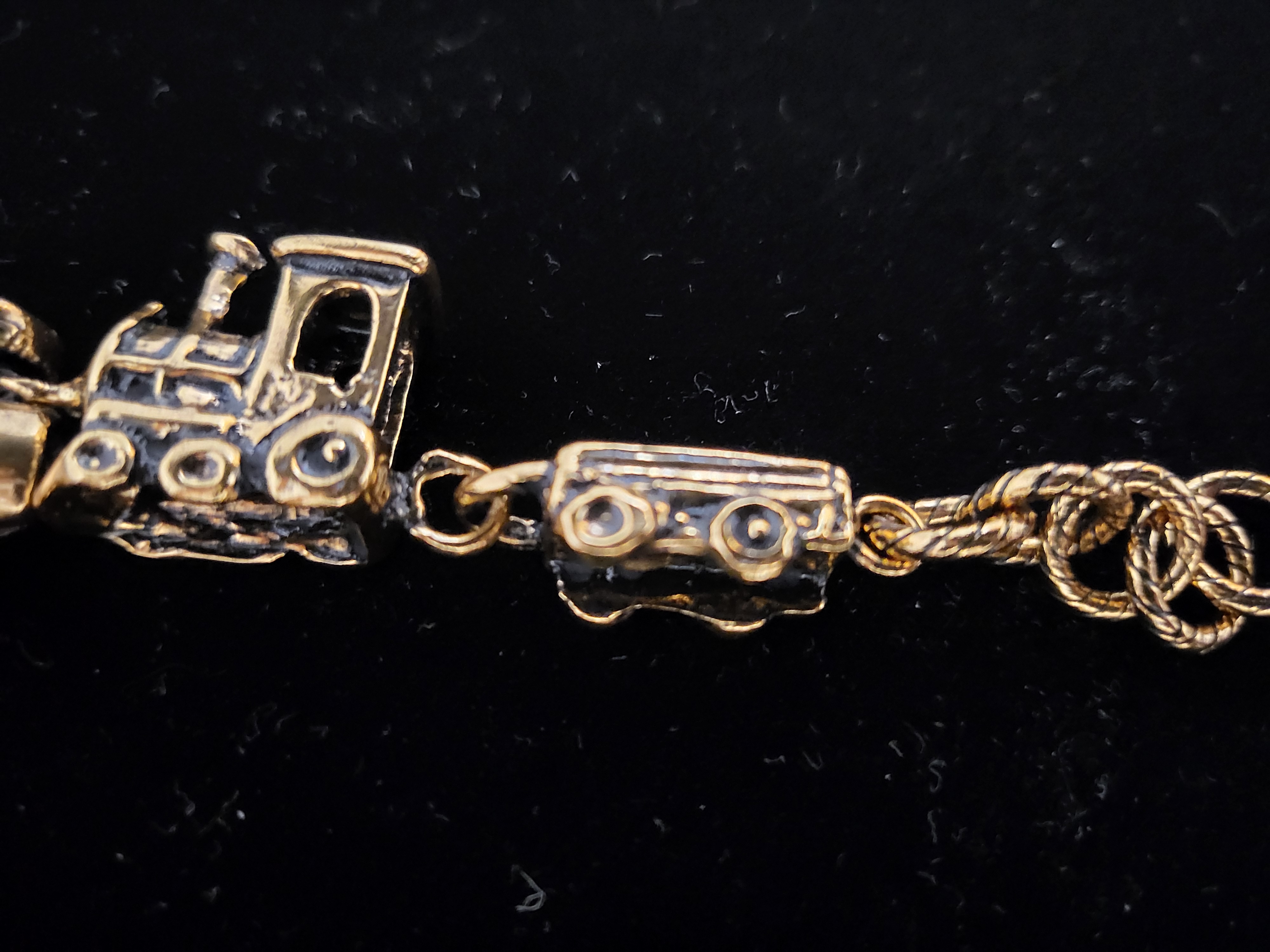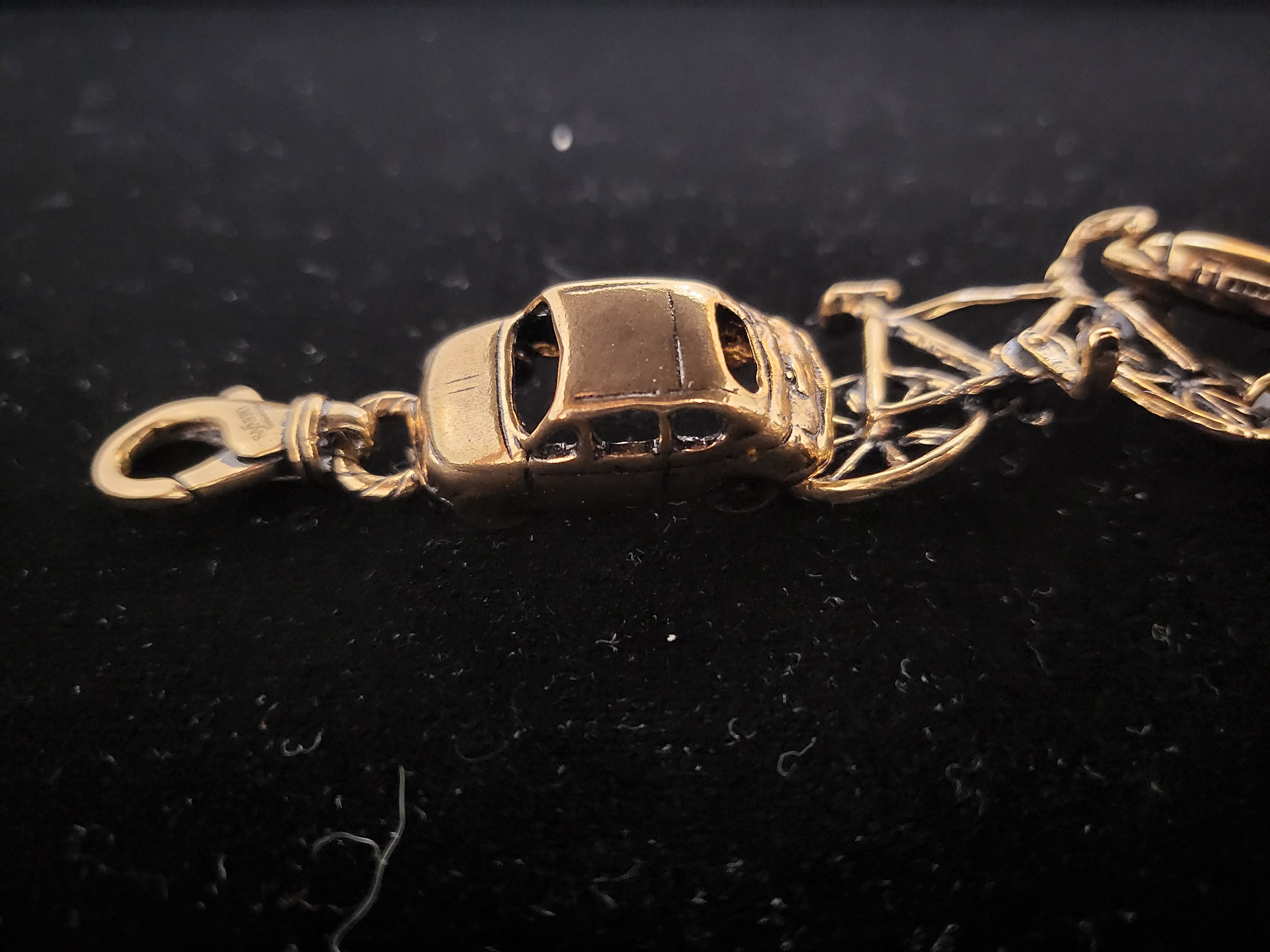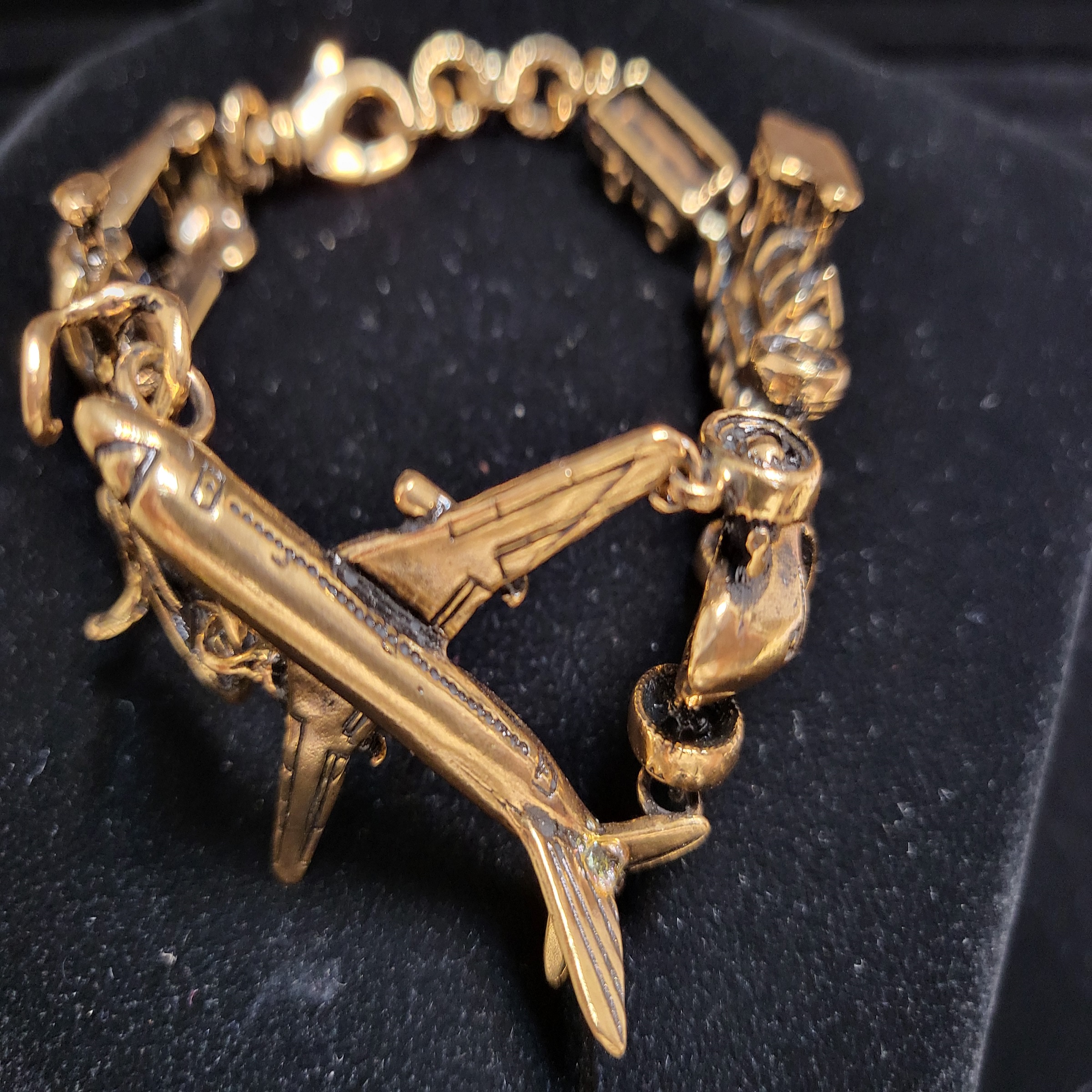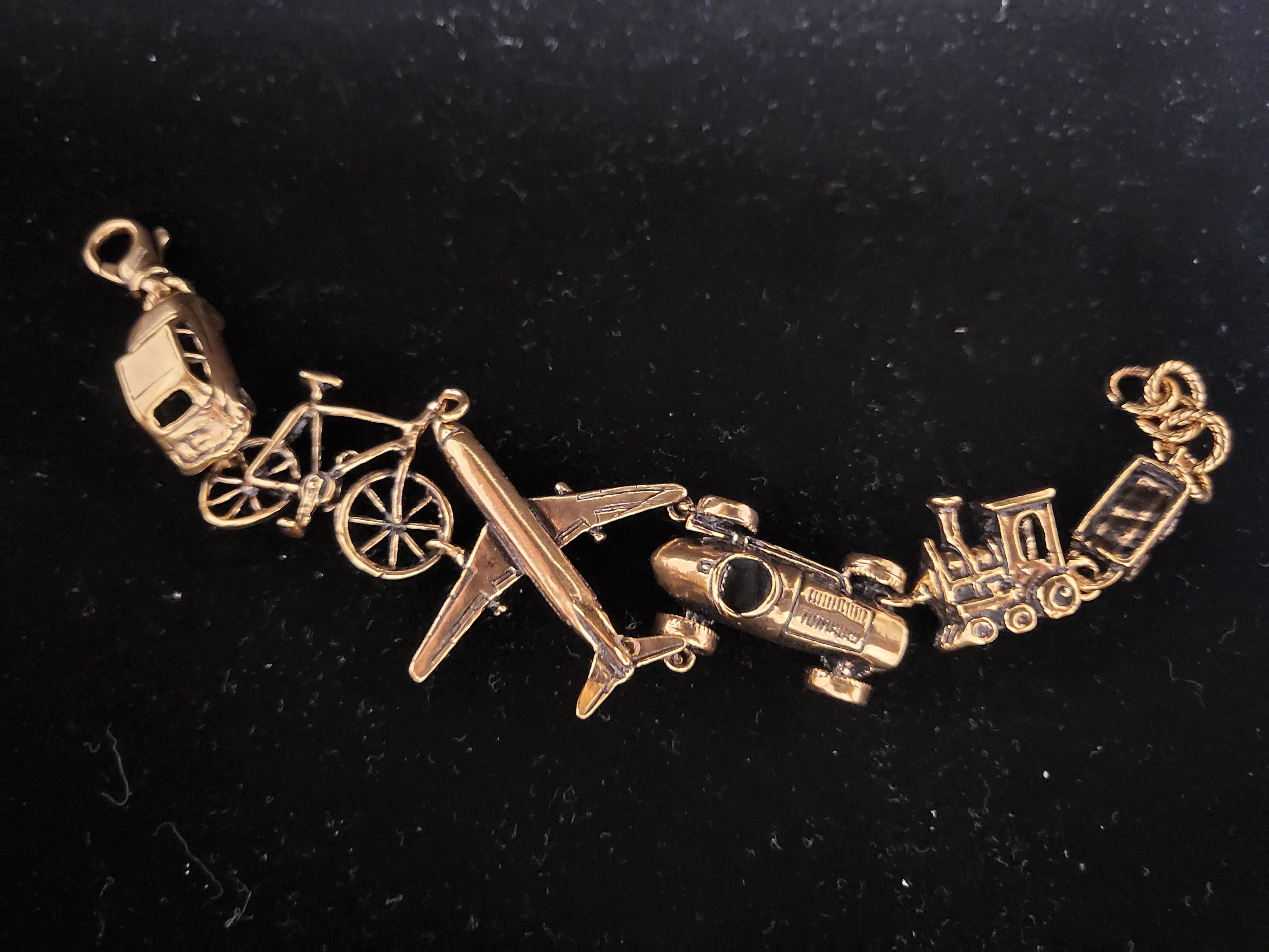 Unique design in semi-rigid bracelet in golden brass with car, bike, plane and train miniatures.