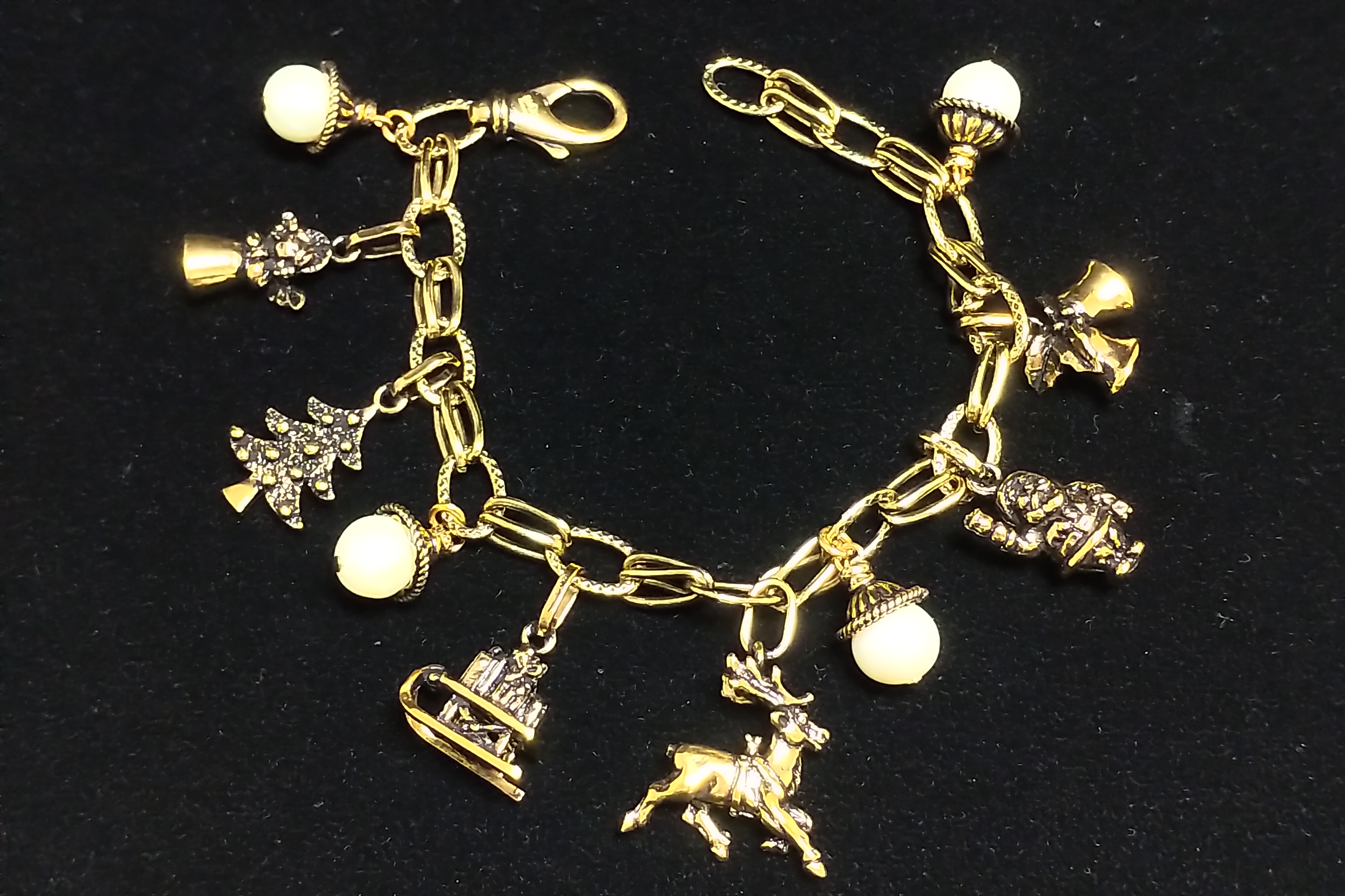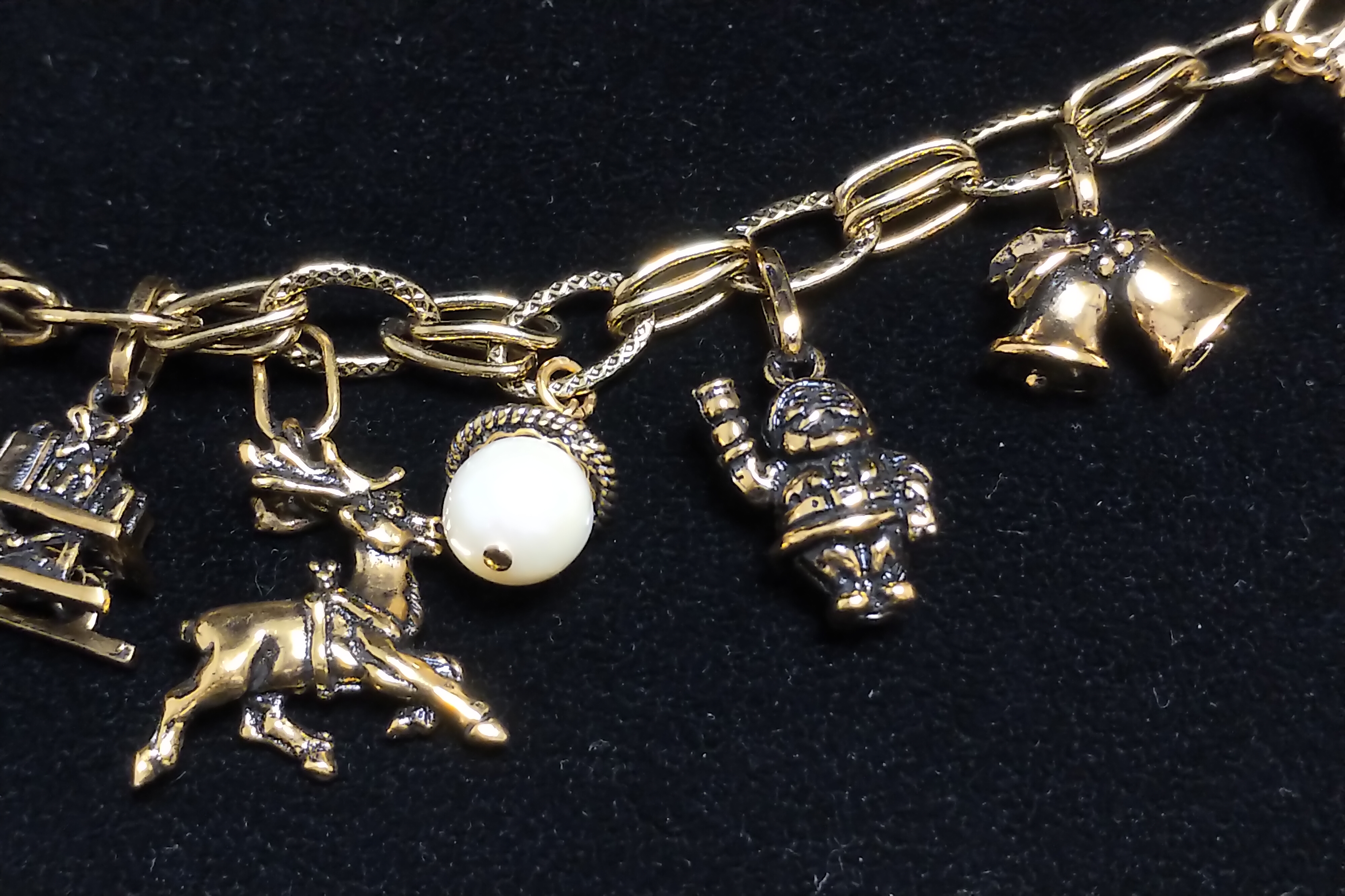 • Bracelet with Christmas-themed pendants in golden brass: a little angel, a Christmas tree, a sleigh with reindeer, Santa Claus, bells and pearls.