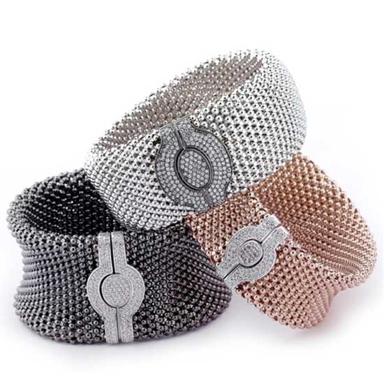 Shown here is a collection of bold beaded bracelets in various colors. Sparkling cubic zirconia clasps decorates this bracelet elegantly. This cage-inspired metallic bracelet adorns your look in any occasion.