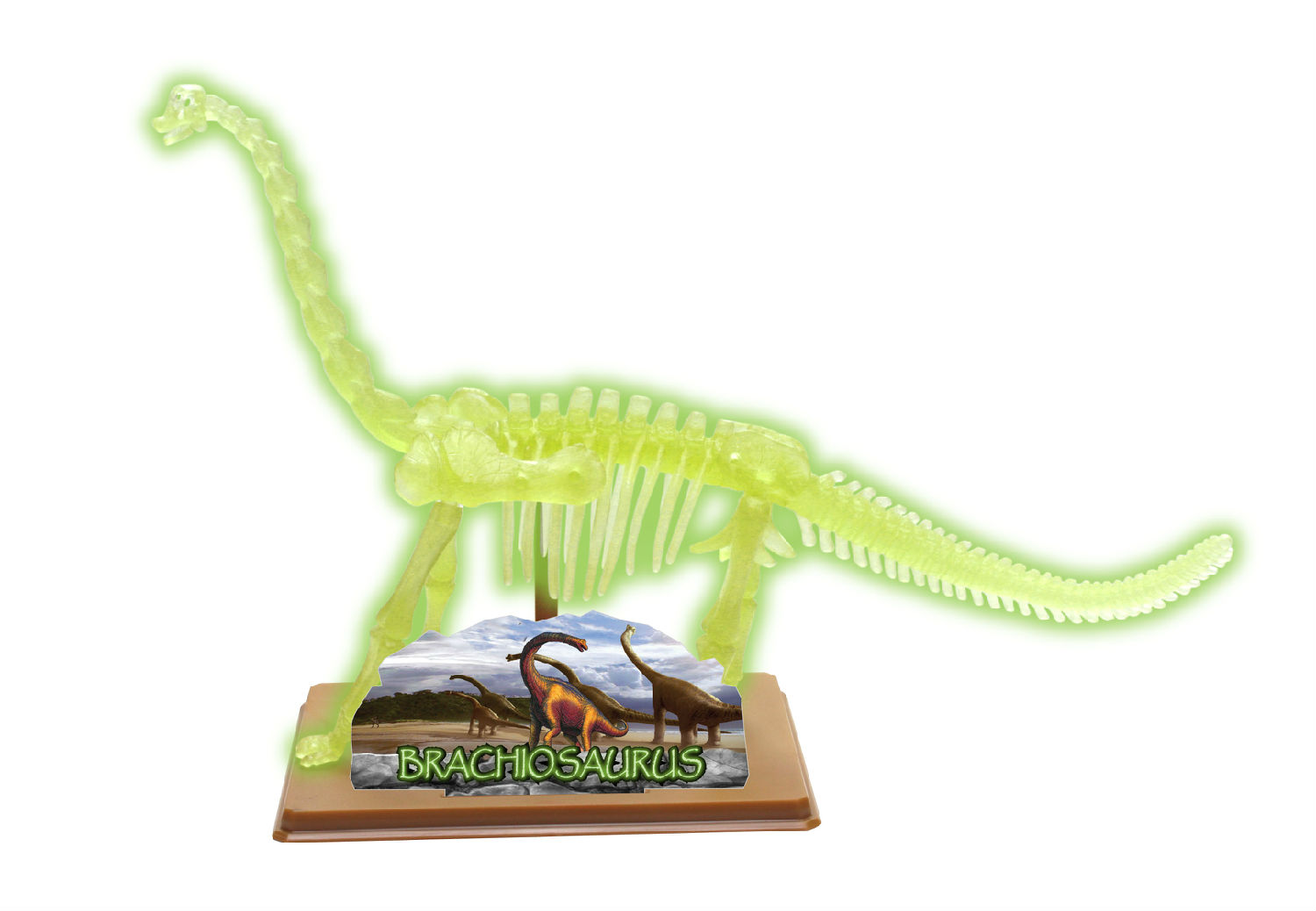This dinosaur skeleton toy features a brachiosaurus design and can glow in the dark. It includes 14 bone pieces, 1 base, 1 supporting holder, 2 supporting pins and 1 name card. The brachiosaurus skeleton is a fun and education toy for kids and is excellent for using as a gift.