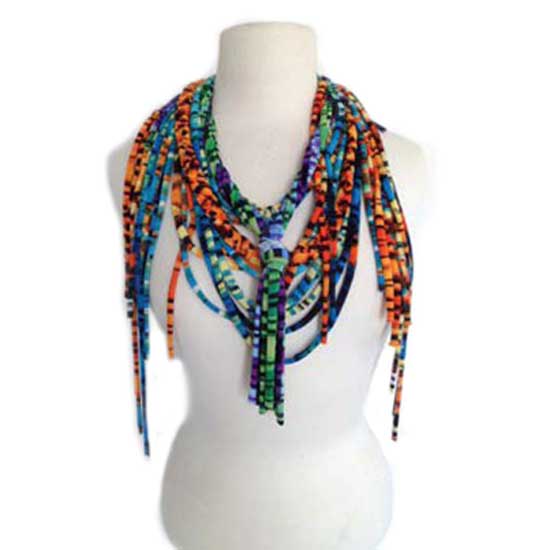 This eclectic scarf features a vibrant mix of colors that is sure to catch plenty of attention. Individual strands are draped around the wearers neck to form this colorful neck piece and the scarf is knotted in the middle to finish off the look. This unique neckwear will brighten up any outfit.