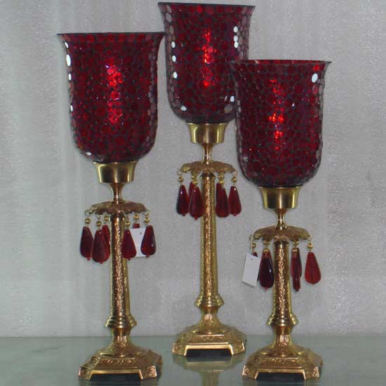 Featured here is a set of brass candle holders with an elegant design. The mosaic glass brings an artistic flavor to the entire piece. This brass candle holder set is a great addition for your living room.