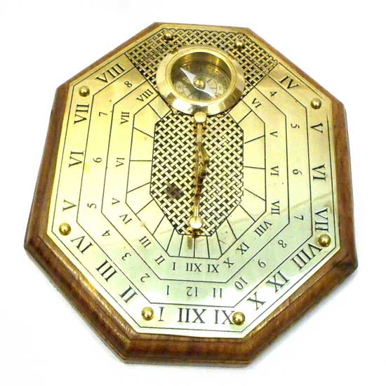 The brass compass clock features an octagonal shape with a ridged wooden platform, showcasing a vintage touch. It is exquisitely engineered with high precision and accuracy. Add antique charm to your home with this stunning brass compass clock.