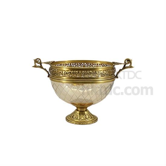 The tasteful bowl as pictured is meticulously crafted with quality brass and glass. It boasts an intricate cut-out pattern at the top rim and aesthetic handles on the sides, presenting as a high-style decorative craft for home, wedding, or settings alike. With a textured pedestal base, the brass dish will look great on any flat surface.