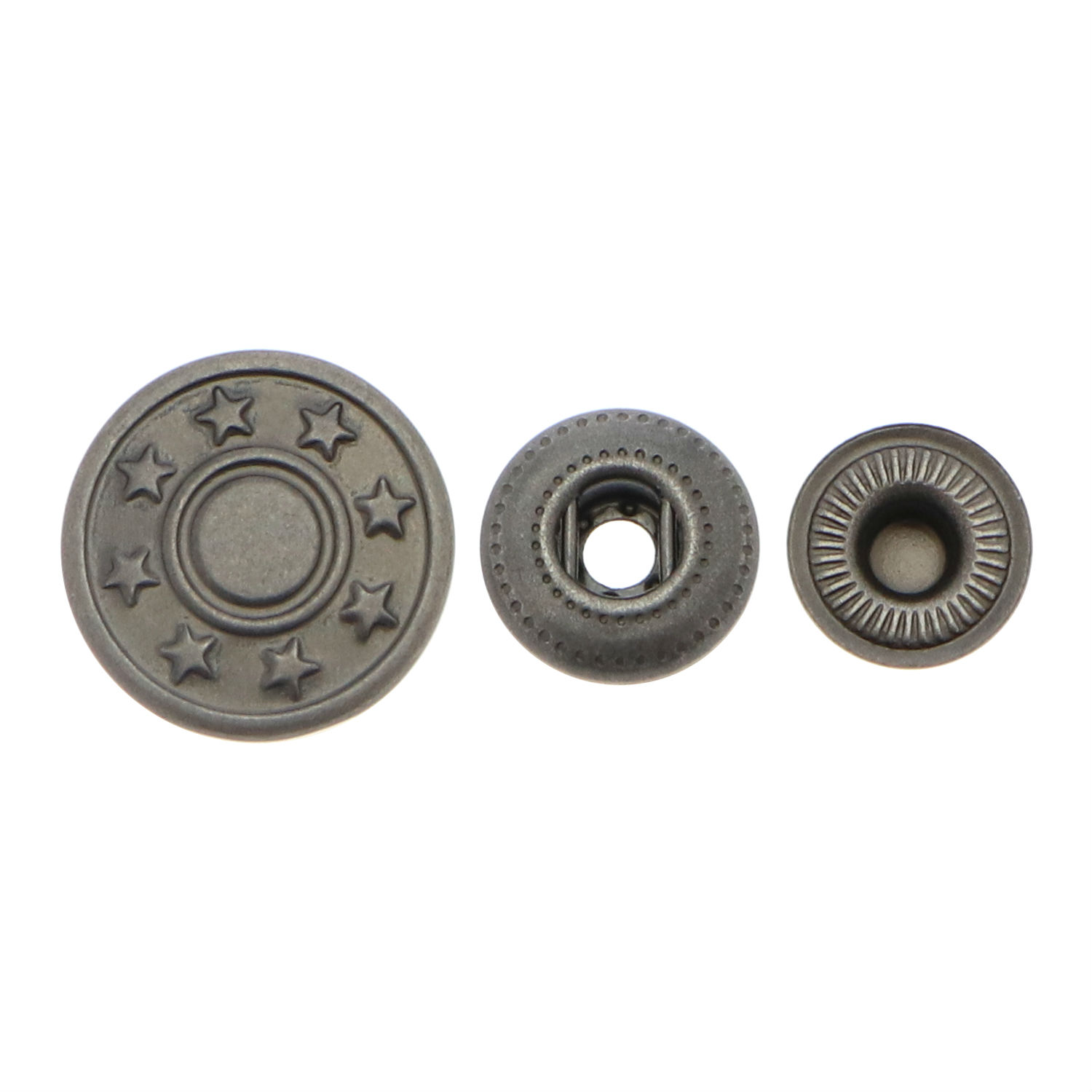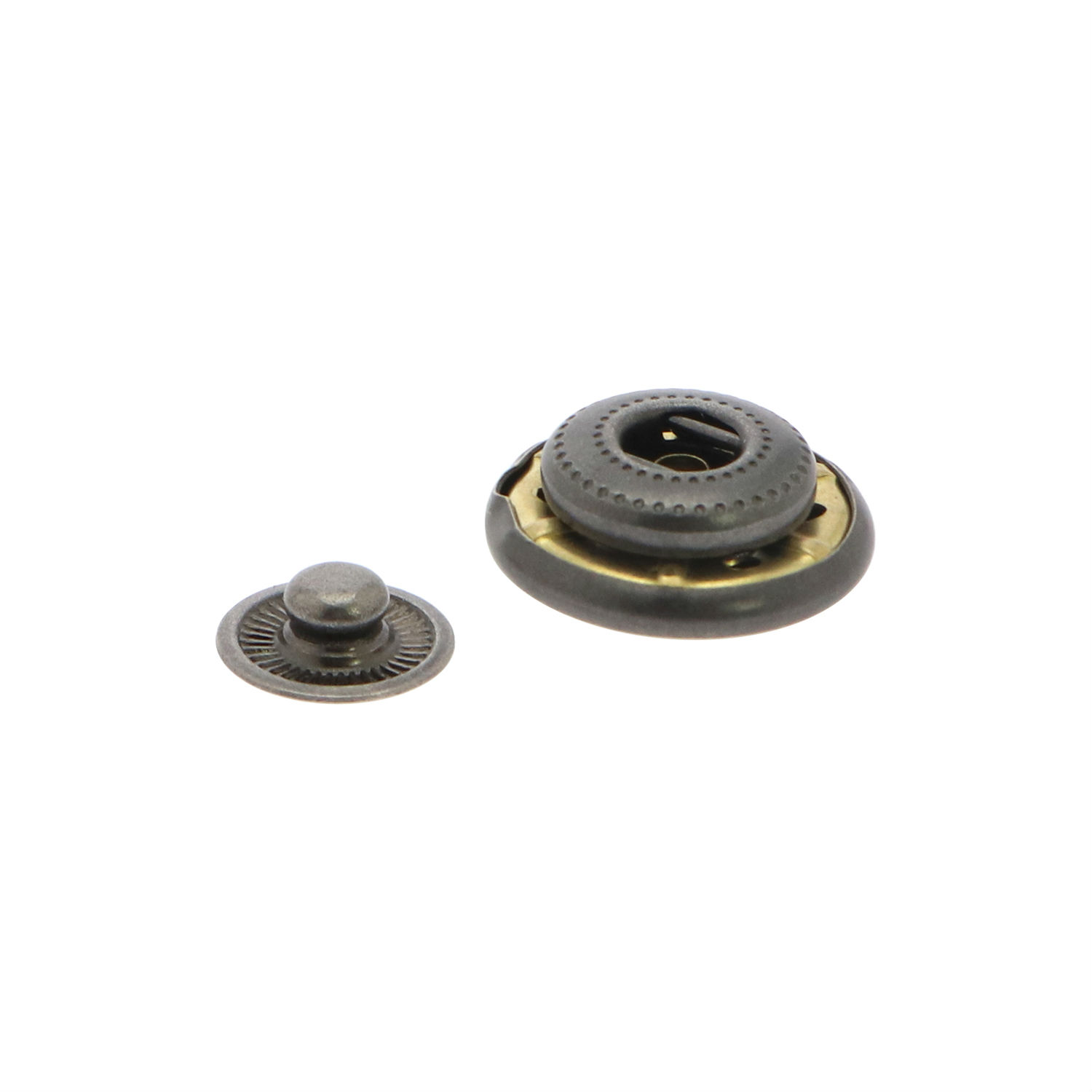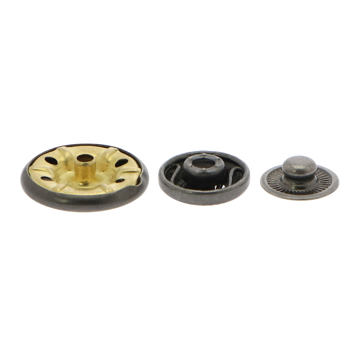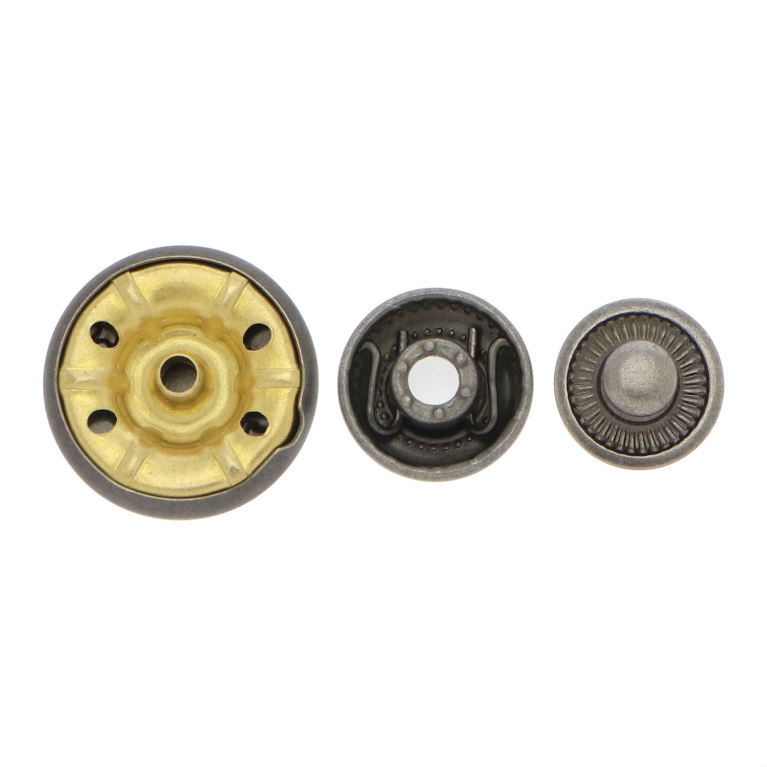 This snap button is made of brass and comes in a 3-part design. It has a round body with plated finish and has a stud and socket for buckling together. The snap button comes in a vintage style and offers a secure fastening solution.