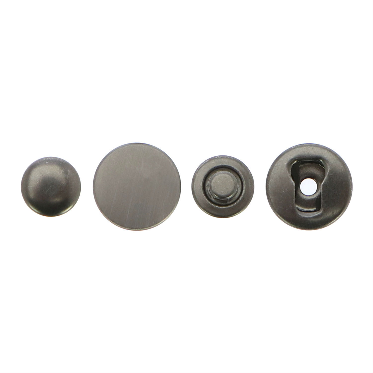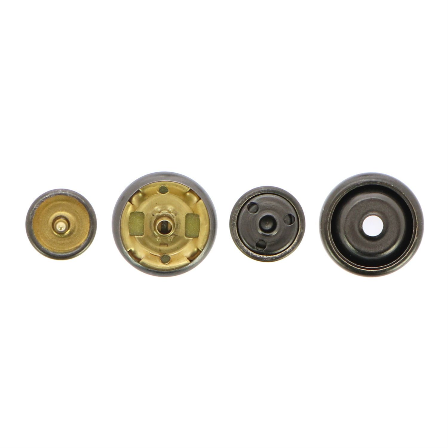 Fasten clothes, bags and other items with this round brass snap button. It comes in a four-part design and includes two caps, one socket and one stud. This brass snap button offers quick and secure fastening and is well-crafted to ensure high durability.