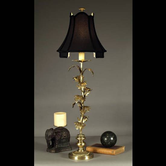 This brass table lamp features a traditional bell-shaped shade in dark black color for a kind of mysterious beauty. With the leaf-like carvings and the round stand, this lamp enhances the aesthetic feeling of a room through the reflection and diffraction of light. The shiny lighting fixture brings light to any room with style and elegance.
