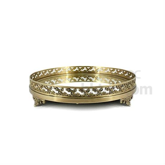 Displayed here is a gorgeous circular tray that is inset with a mirror glass. Intricate and appealing in appearance, the tray offers aesthetic cutout filigree details throughout the rim. To complement the impeccable finish in antiqued style, the tray is lacquered for a gleaming, durable shine. You can use it to brighten up the interior decor of any room at home.