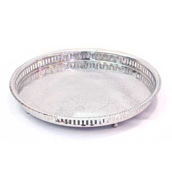 The tray is finely made of brass in nickel-plated finish. The brass tray showcases excellent craftsmanship and details to attention. The sparkling tray is surely ideal to brighten up any kitchen.
