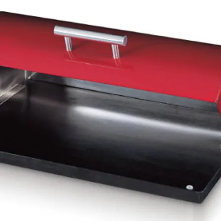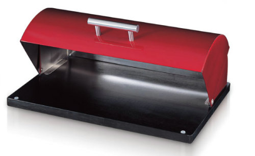 With a roll top cover in red coating and a black rubber wood base, the contrasting color design of this bread box exhibits a contemporary style. The stainless steel handle on the cover provides you with easy opening of this food container.