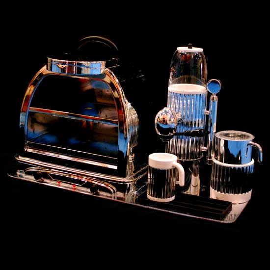 Shown here is a multipurpose breakfast maker for convenient household use. This appliance combines the functions of a toaster and drink dispenser into one piece. The metal structure is plated with a shiny coating.