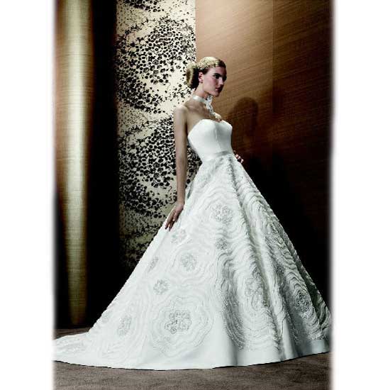 This elegant bridal dress is designed with a top bodice to show the wearers' figure perfectly. The extended ruffled hemline is accented with elegant floral details in a wavy background. This bridal dress showcases a great sense of purity and fineness.