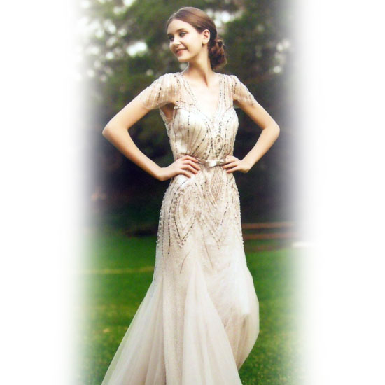 This is a bridal dress that is made of quality material for a natural texture. It is designed with a classic V-neckline, short sleeves and a loose skirt. The allover dazzling beads add a touch of elegance to the whole piece.