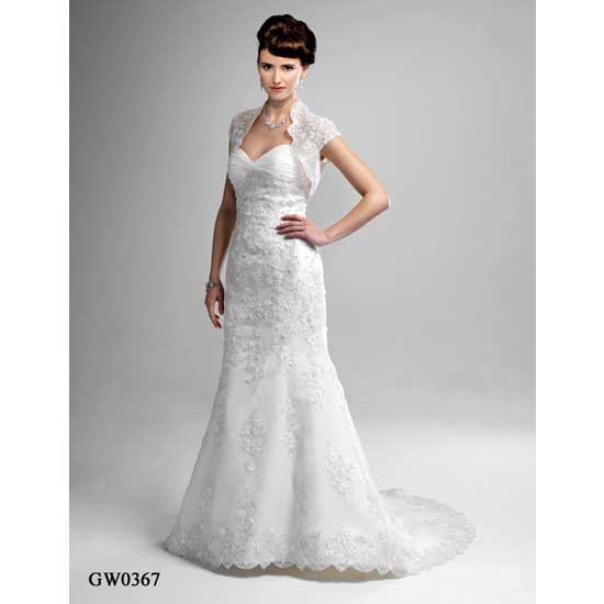 As shown is a bridal gown with a pair of sweetheart busts. Its long skirt coming with a train is stunningly trimmed with scattered floral-shaped embellishments. In addition, the gown is complemented with a lace bolero jacket.