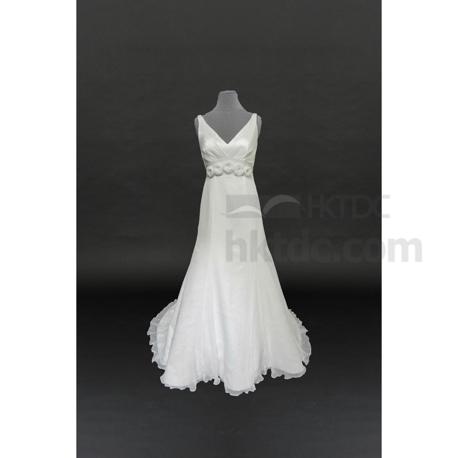 Marriage is all about commitments and promises. This meticulously designed wedding dress guarantees to offer a stunning feminine look on the big day. The slightly ruched bodice with a strappy deep-V neckline is designed to ample up the bodice for enhanced elegance. To accentuate the empire waistline, it is delicately decorated with blossoming floral accent. The A-Line cut floor length pleated hem further brings an irresistible charm.
