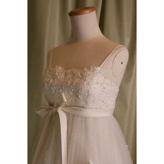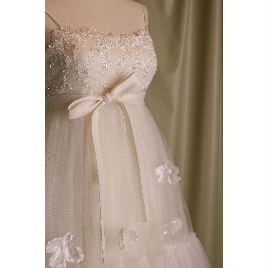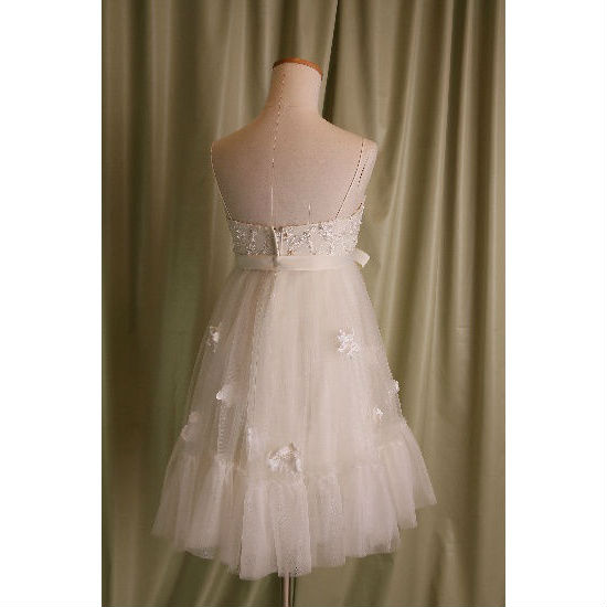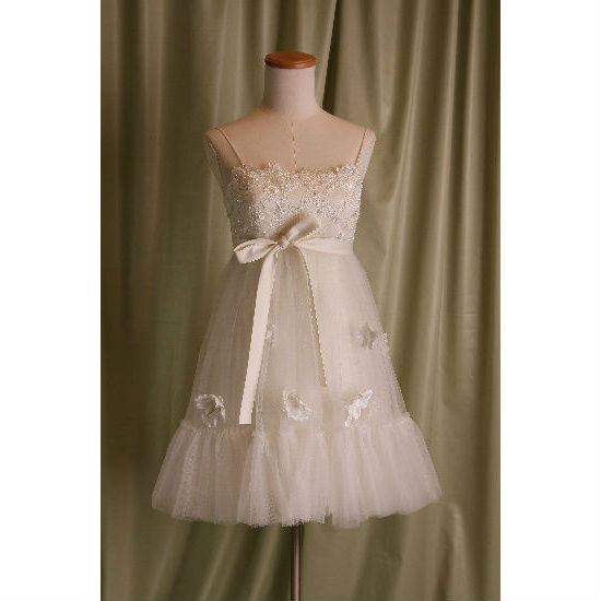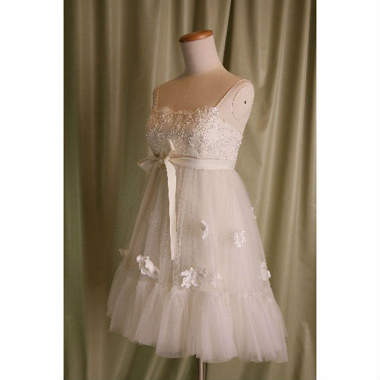 This bridesmaid dress features everything you need for a young and cute look. It cascades to the knee with a lace flowers. The thin spaghetti straps bandeau neckline accentuates your feminine curves while the lace waistband on the waist completes the design with a cute look.
