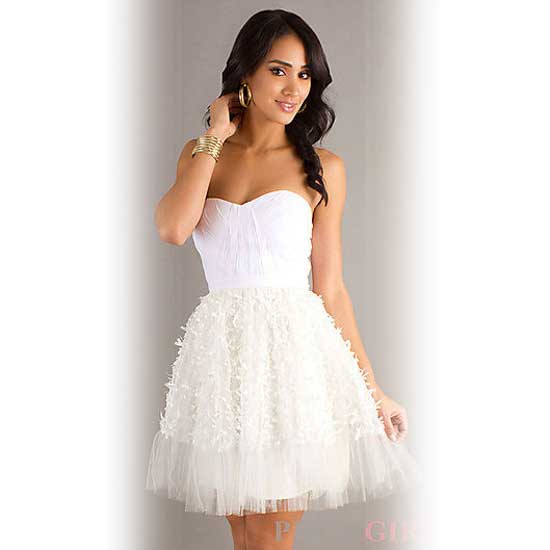This is a Bridesmaid Dress that comes in pure white. The ladies' wedding dress flaunts a strapless design. It has a fitted bodice to accentuate the woman's figure. This dress is the perfect choice for ladies in the important wedding party.