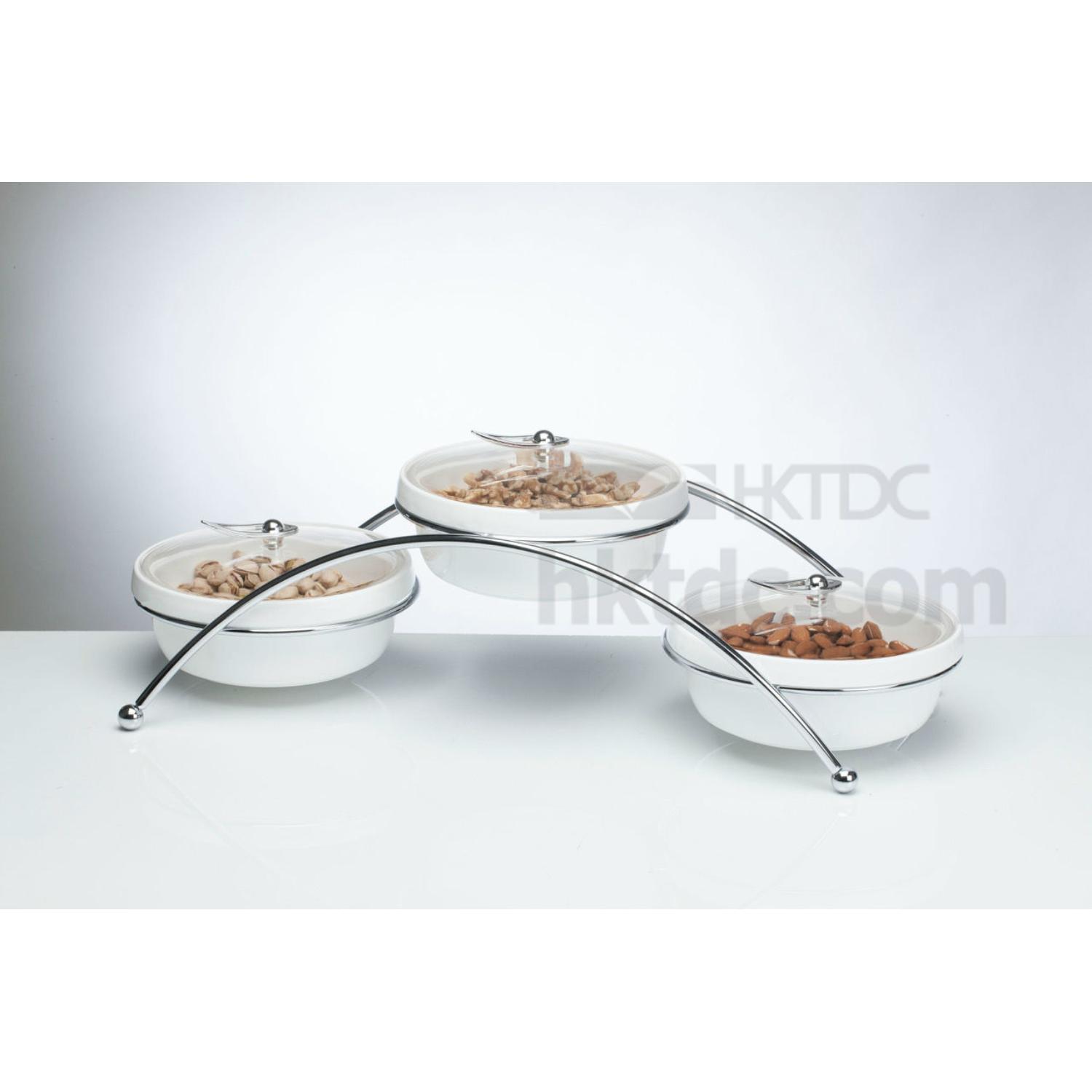 • Set Includes three round condiment bowls in an elegant metal caddy for candies, cookies, fruits, salads and chips.