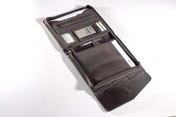 - Includes writing pad, zippered pockets, cell phone pocket, pen loop and calculator.
