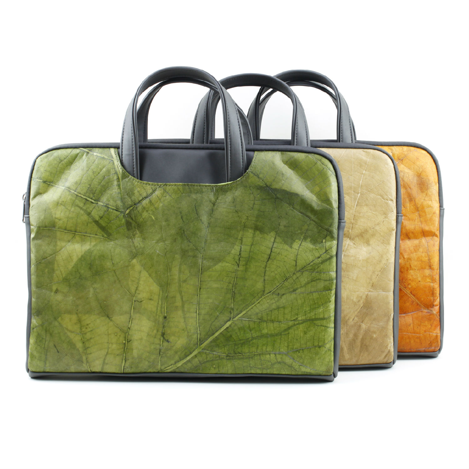 The bags are made by natural tree leaves. The leaf material is naturally grown in the mountains of Southeast Asia, which get wilted easily. Applying its’ own invented technology, they make the non-durable tree leaf become an applicable and environmentally friendly material, and can be mass produced finally.
