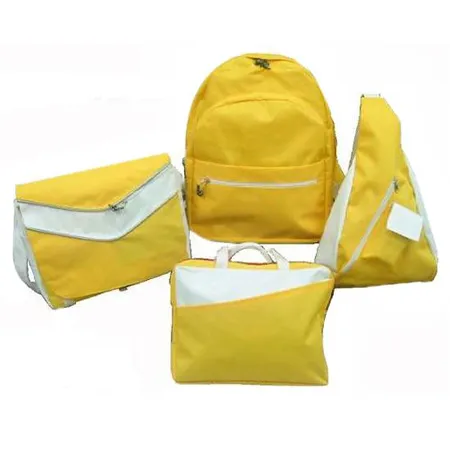 A set of backpack, travel bag, computer bag and briefcase is made of polyster or nylon material. It is mainly in yellow colour. It is in zipper closure.