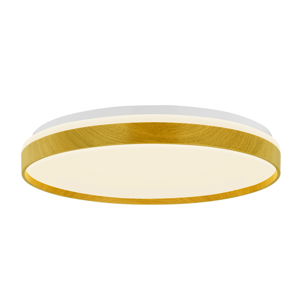This is a circular ceiling light. The edge of the lamp body adopts a simulated wood grain design, presenting a warm wood color, and is matched with the white upper part, with harmonious colors and rich layers. The central light - emitting area emits soft warm light. The overall style combines natural simplicity with modern minimalism, and is suitable for installation in home spaces such as living rooms and bedrooms, creating a warm and comfortable atmosphere for the environment.