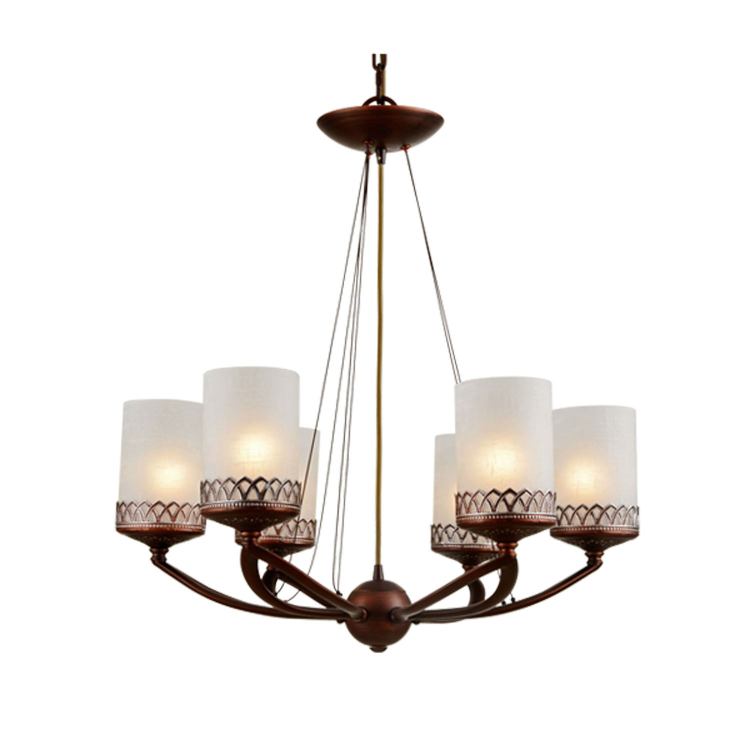 Presented here is a 6-light chandelier made of iron finished in bronze. Its upward facing lamps gently diffuse light from above and provide a soft and warm glow. Matching chains are added to accent the chandelier with a touch of elegance. This is an exceptional piece to add to your contemporary décor.