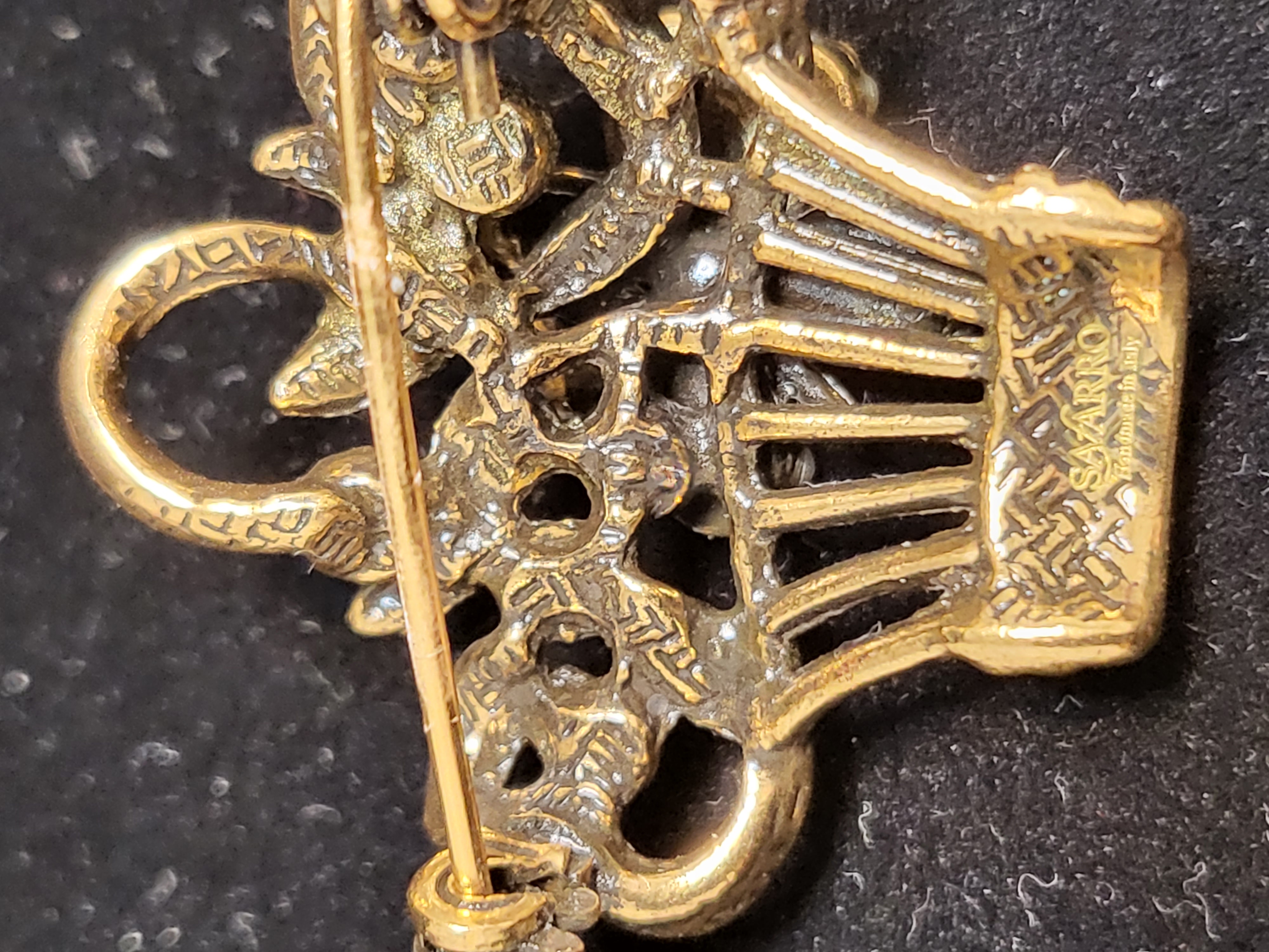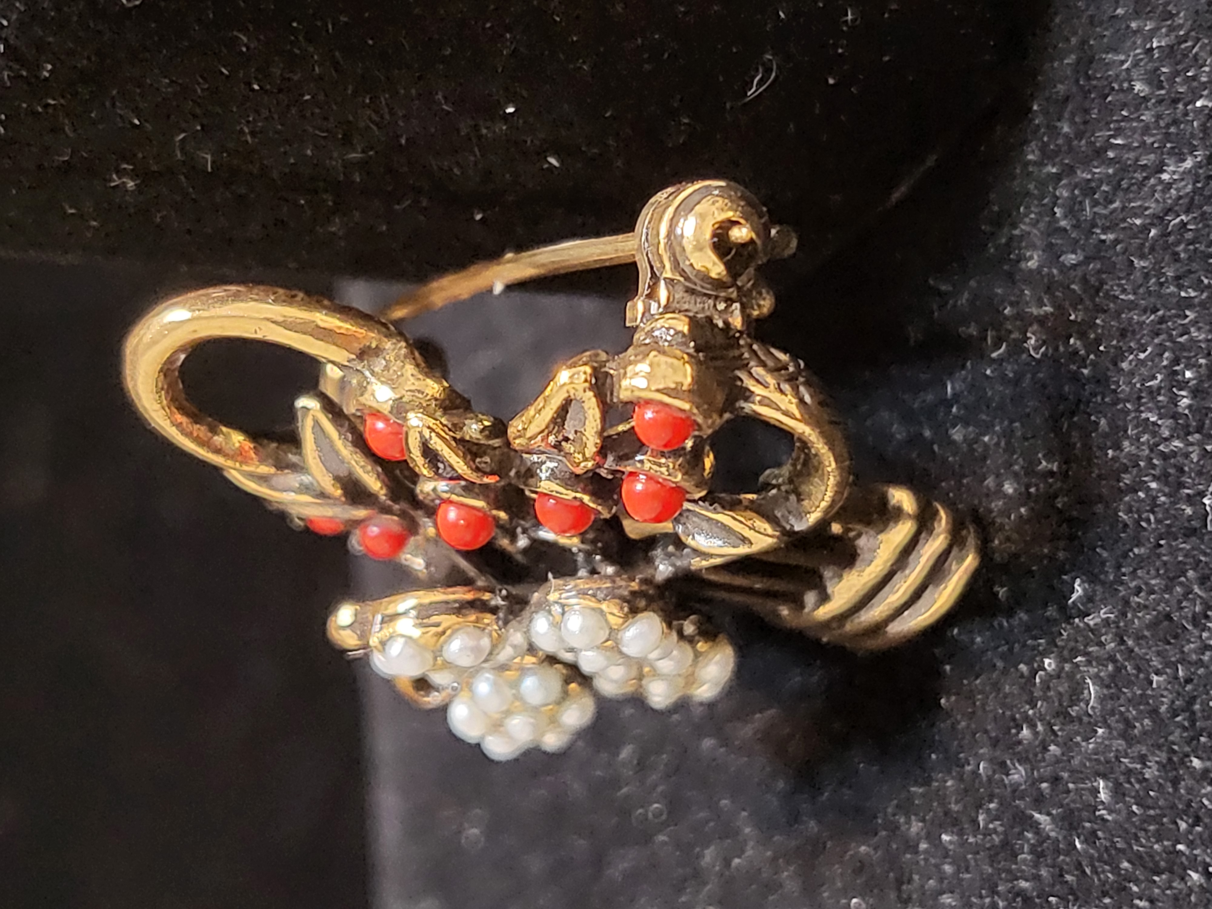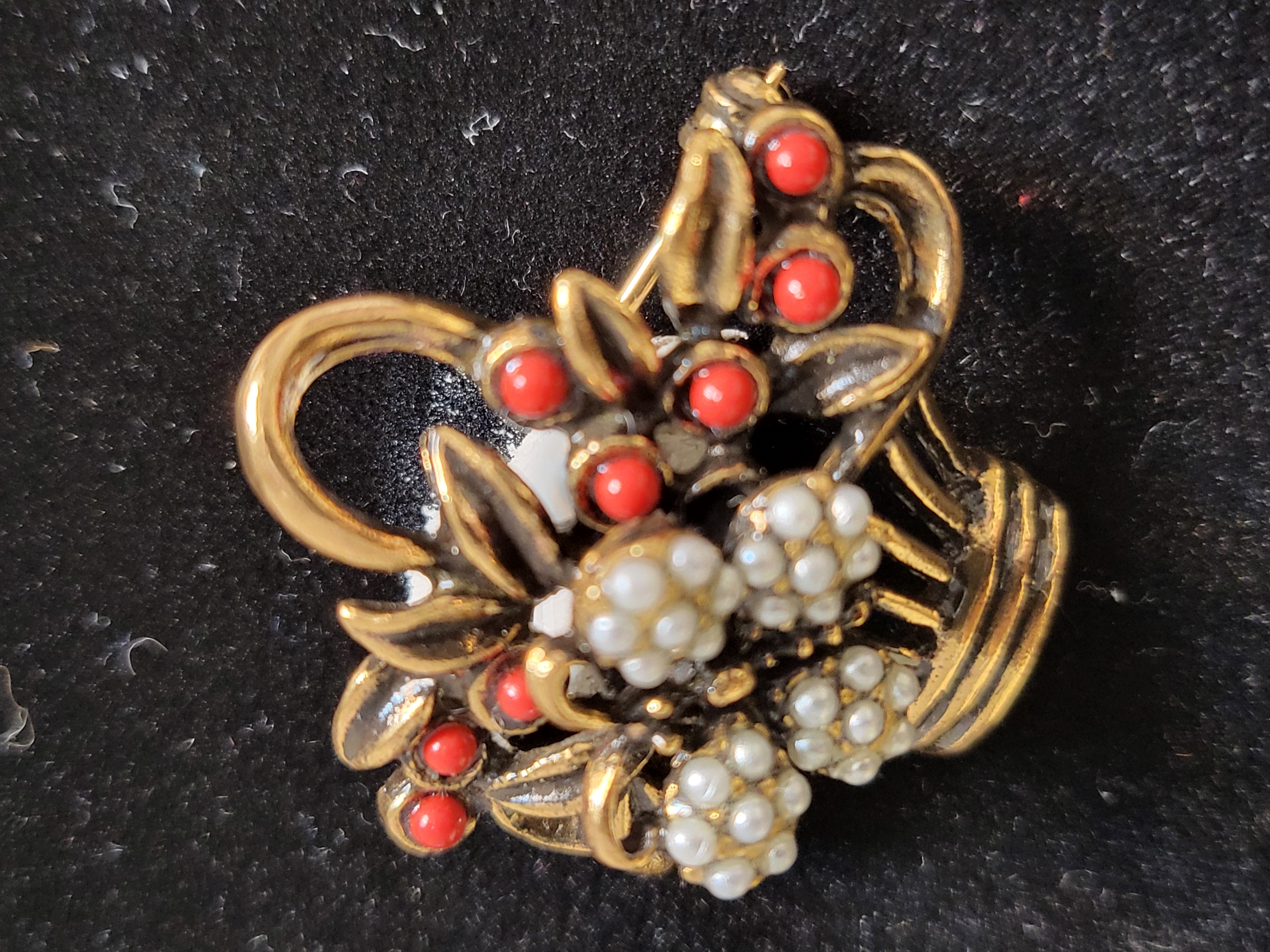 Brooch of gold-dipped brass with butterfly made of pearls resting on a flower basket with red corral berries.