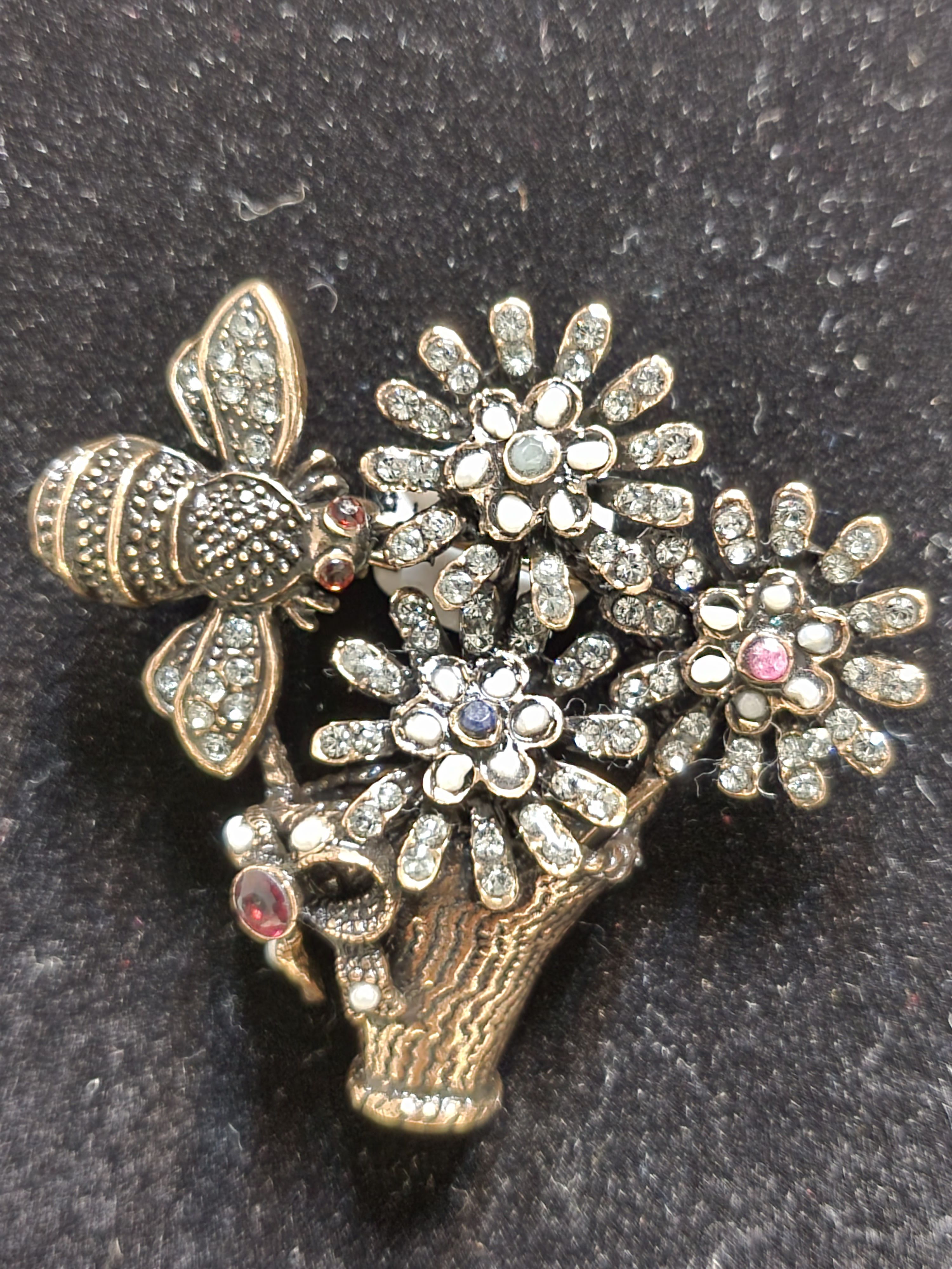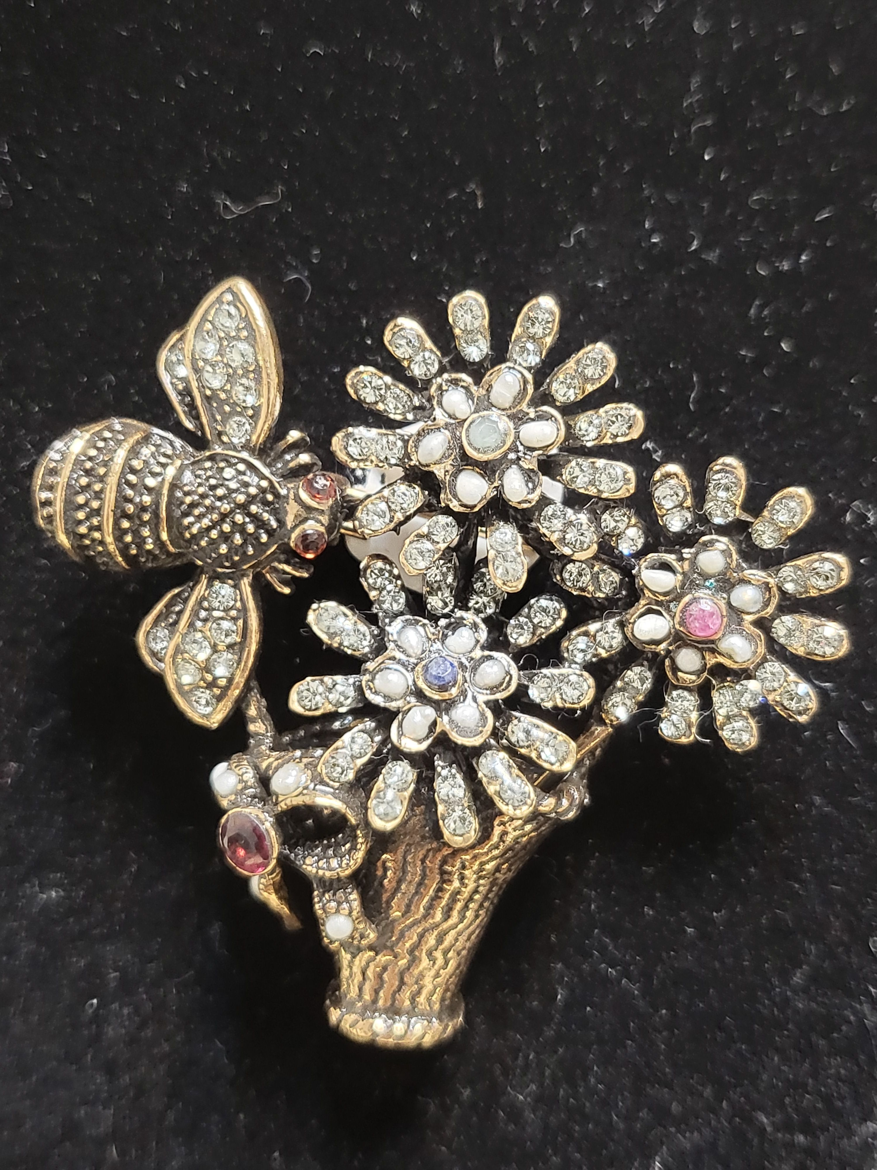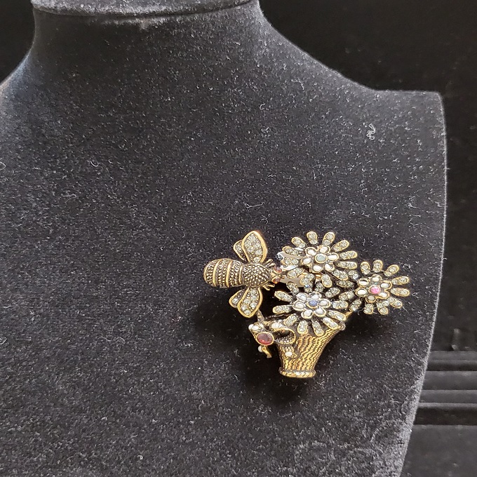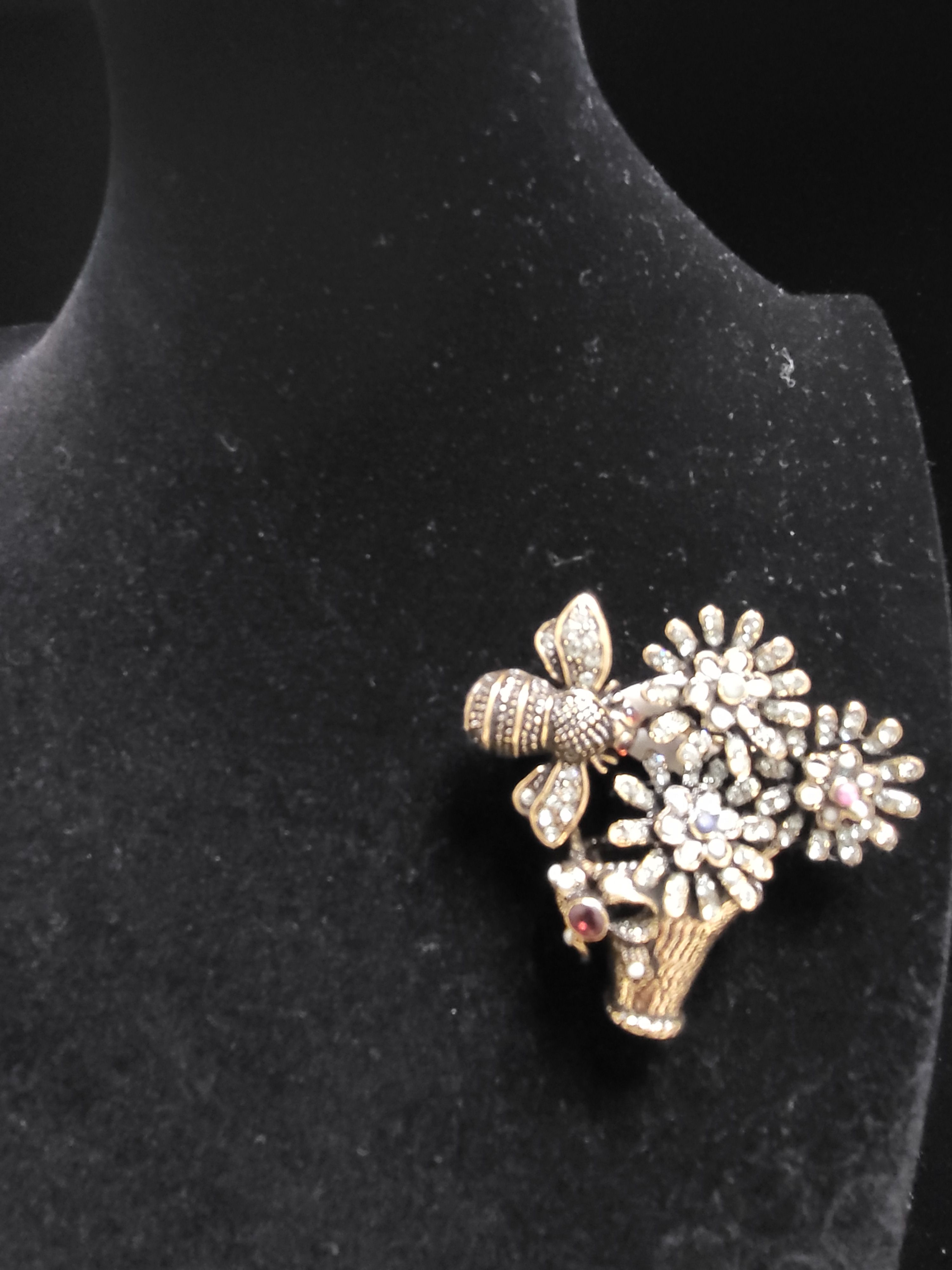 - Brooch of gold-plated brass with basket with flowers, bee and bow with details in garnet; the flowers have pistils of sapphire, garnet and ruby and petals encrusted with micro-pearls and swarovski
