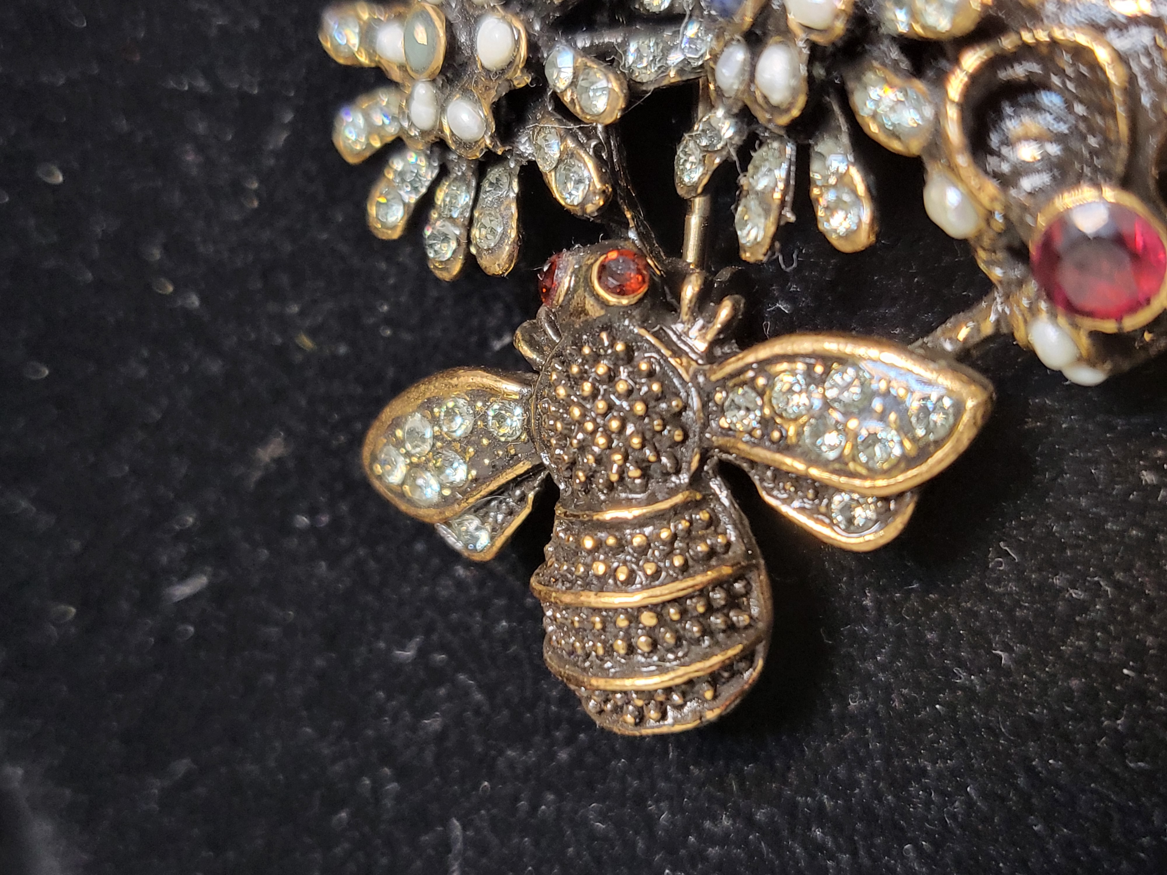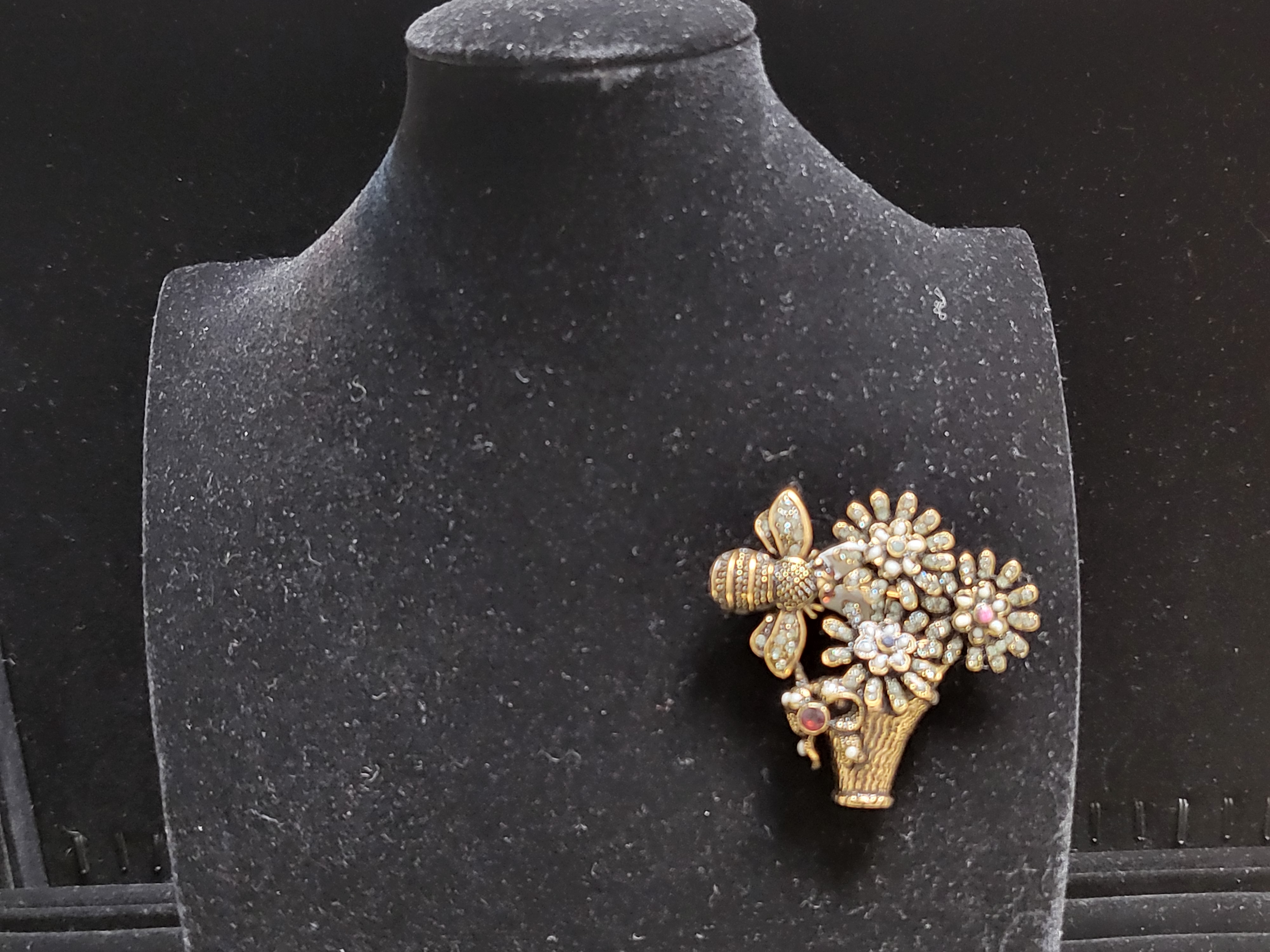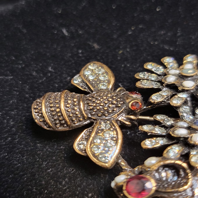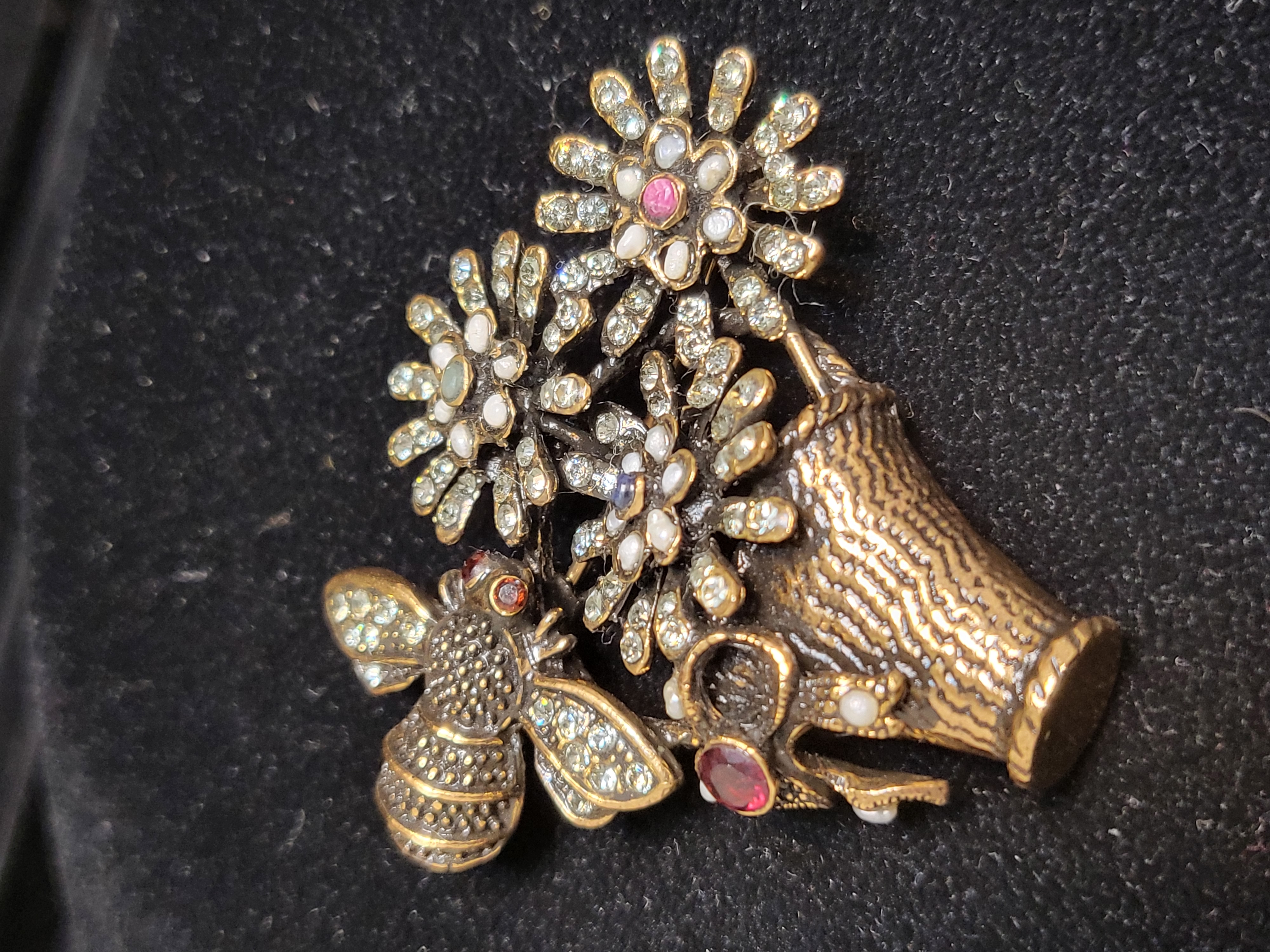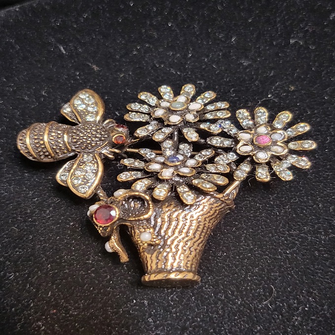 - Brooch of gold-plated brass with basket with flowers, bee and bow with details in garnet; the flowers have pistils of sapphire, garnet and ruby and petals encrusted with micro-pearls and swarovski