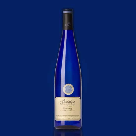 Displayed is a bottle of Riesling that originates from America. Featuring a vibrant light color, this white wine has a fruity nose with floral and lime aromas. This high quality table wine is a good choice to go with chicken, seafood and cheese.