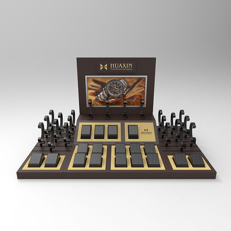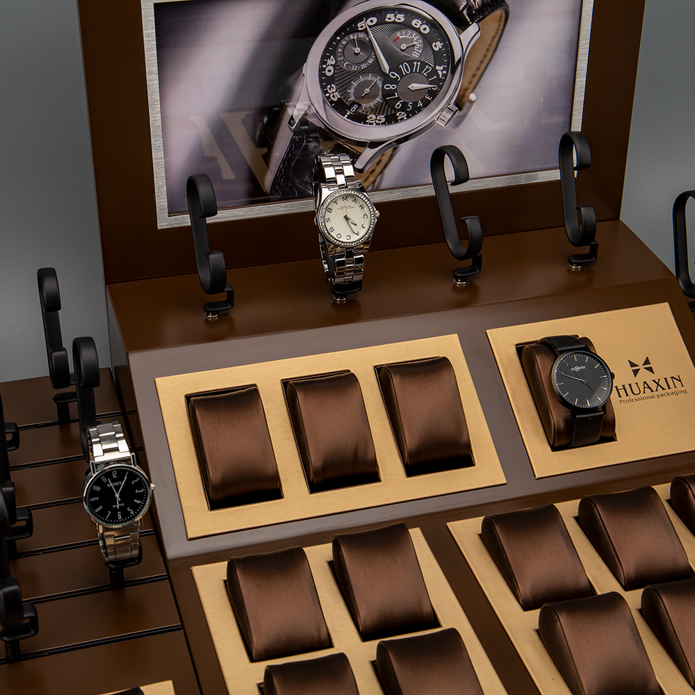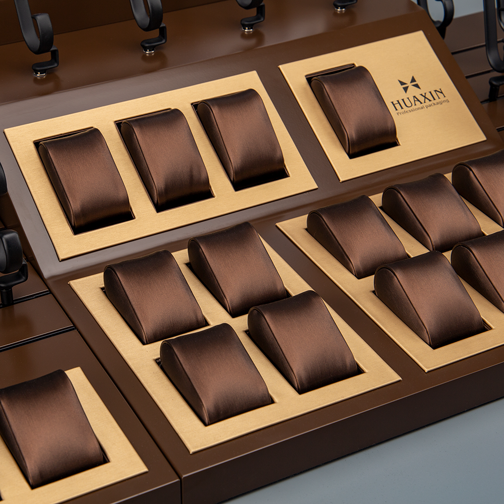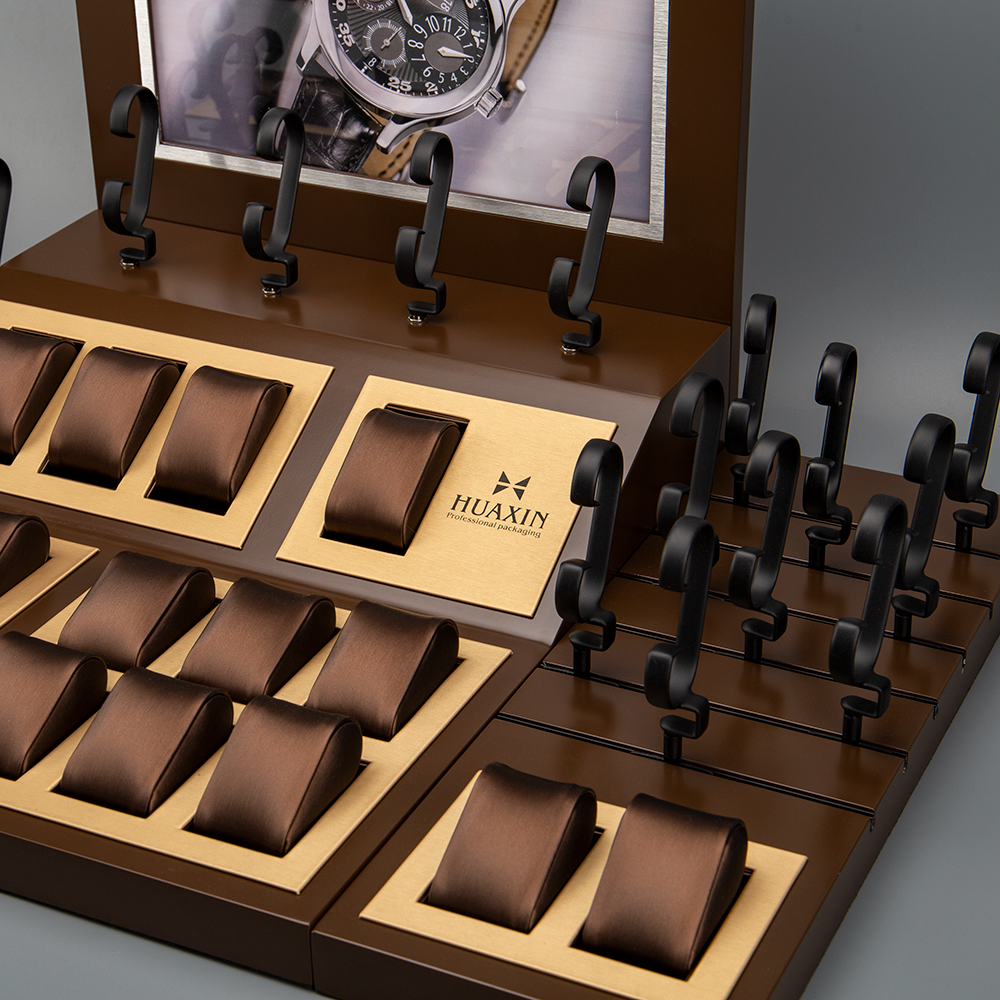 This watch display stand is made of MDF, covered with brown matte lacquered, as well as golden PU leather. The watch display consist of several kinds of accessories, such as C clip, leather pillow, etc. And it can hold 40pcs watches.