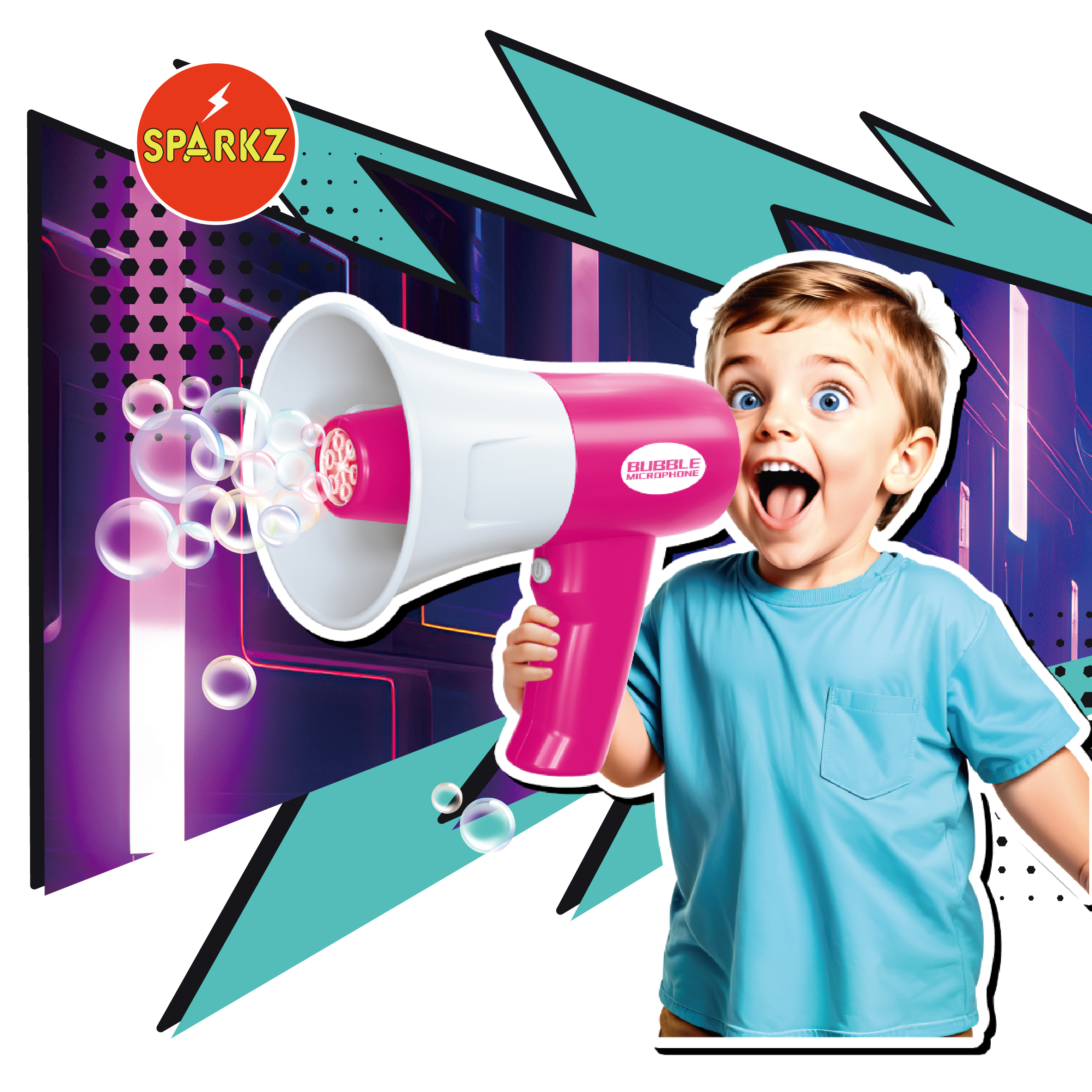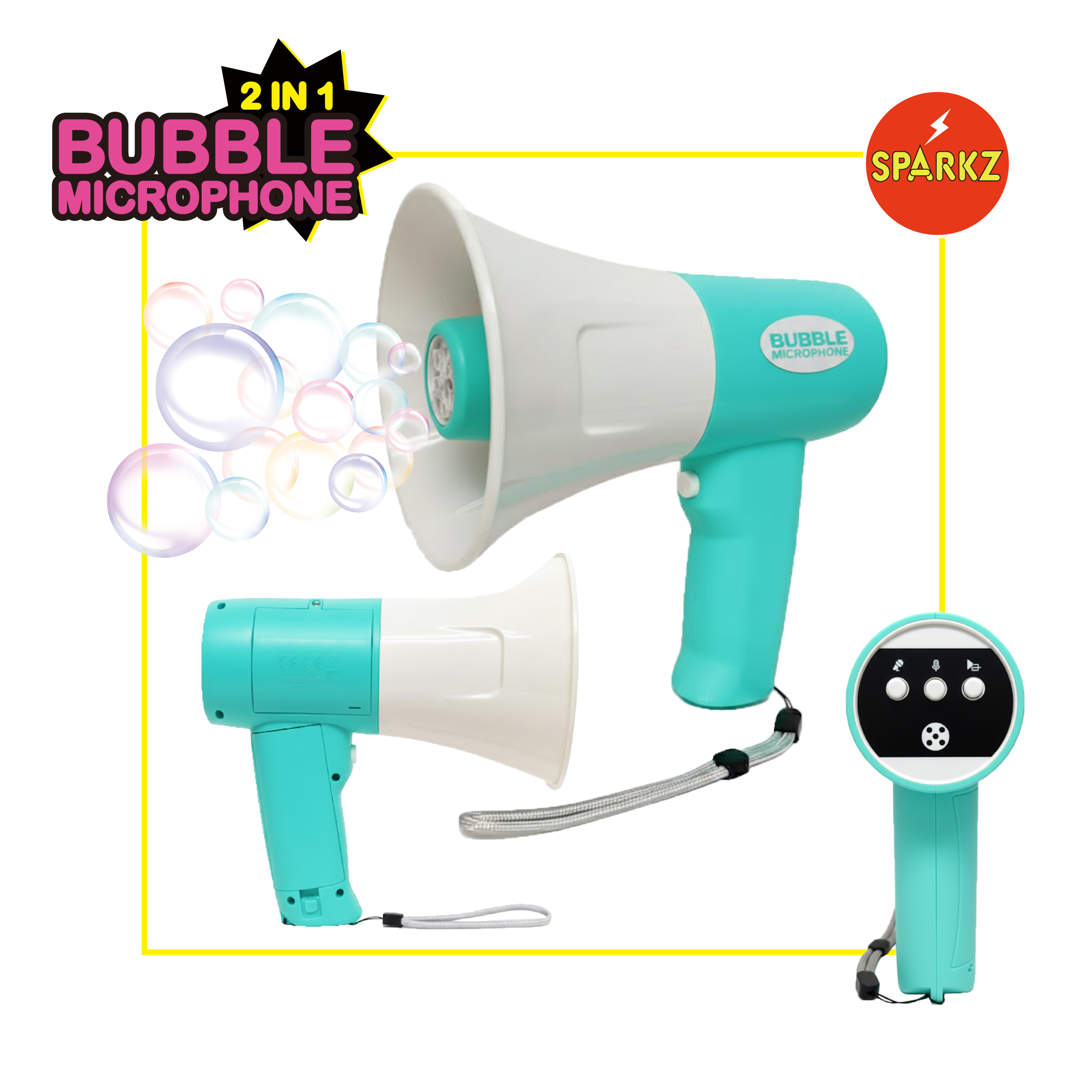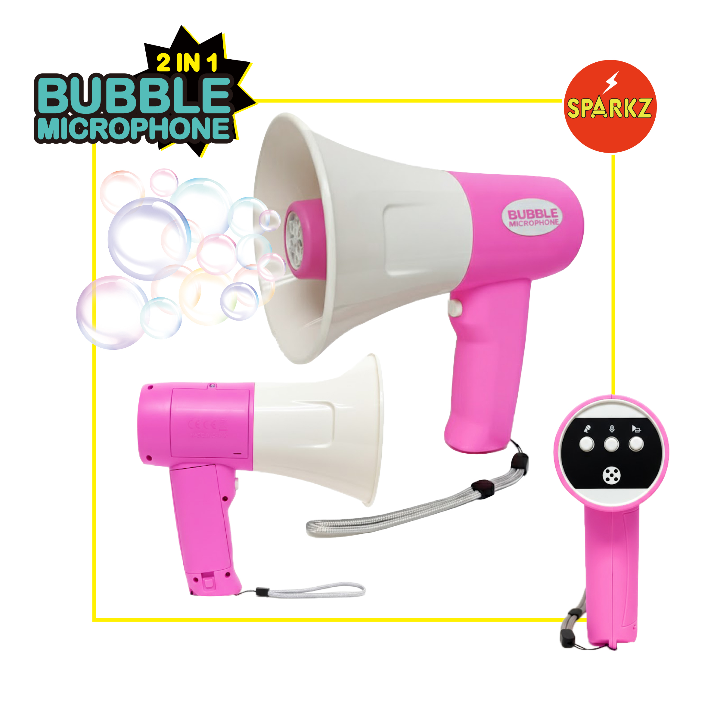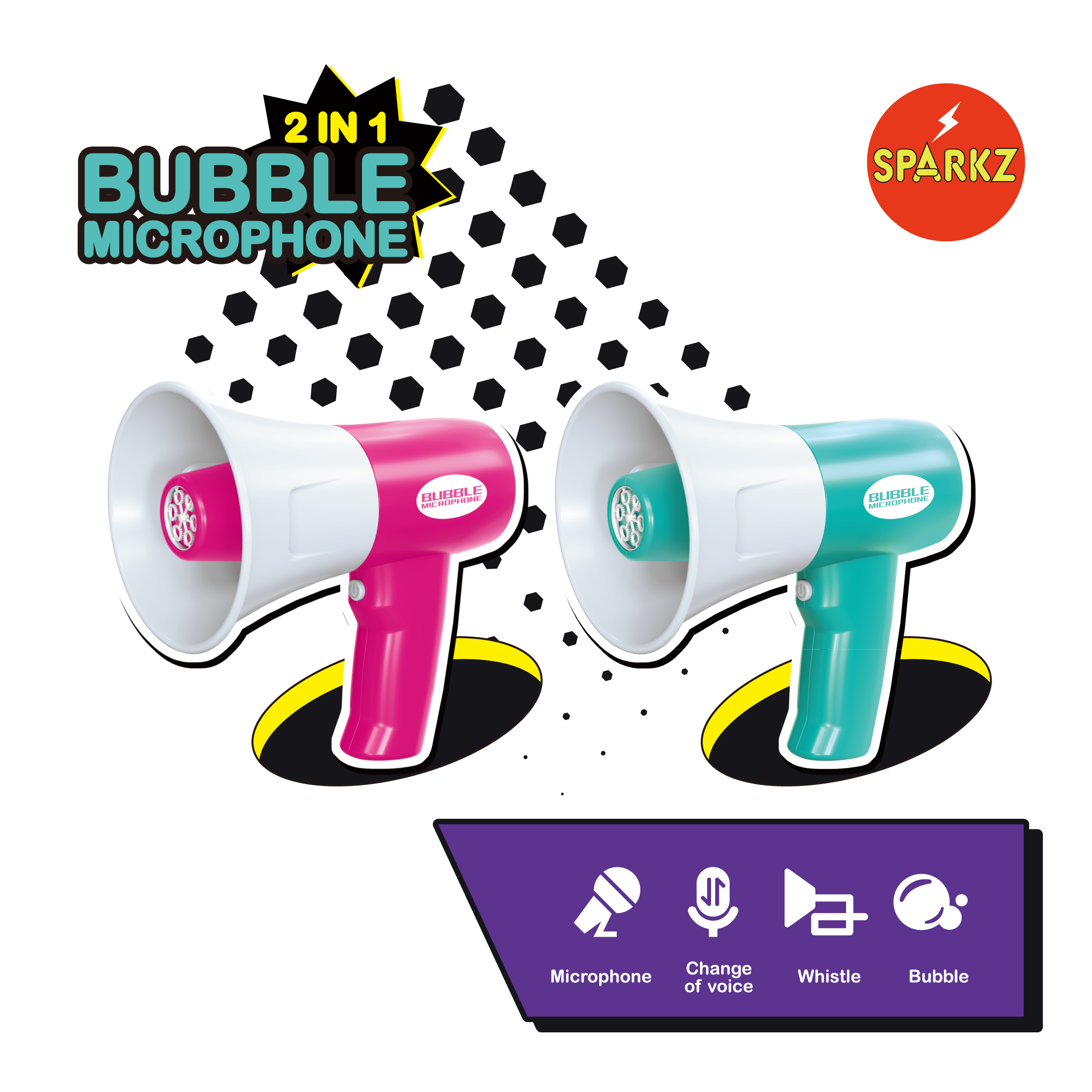 •Press & Bubble! Simply press the trigger to unleash a storm of shimmering bubbles while you speak, sing, or whistle.