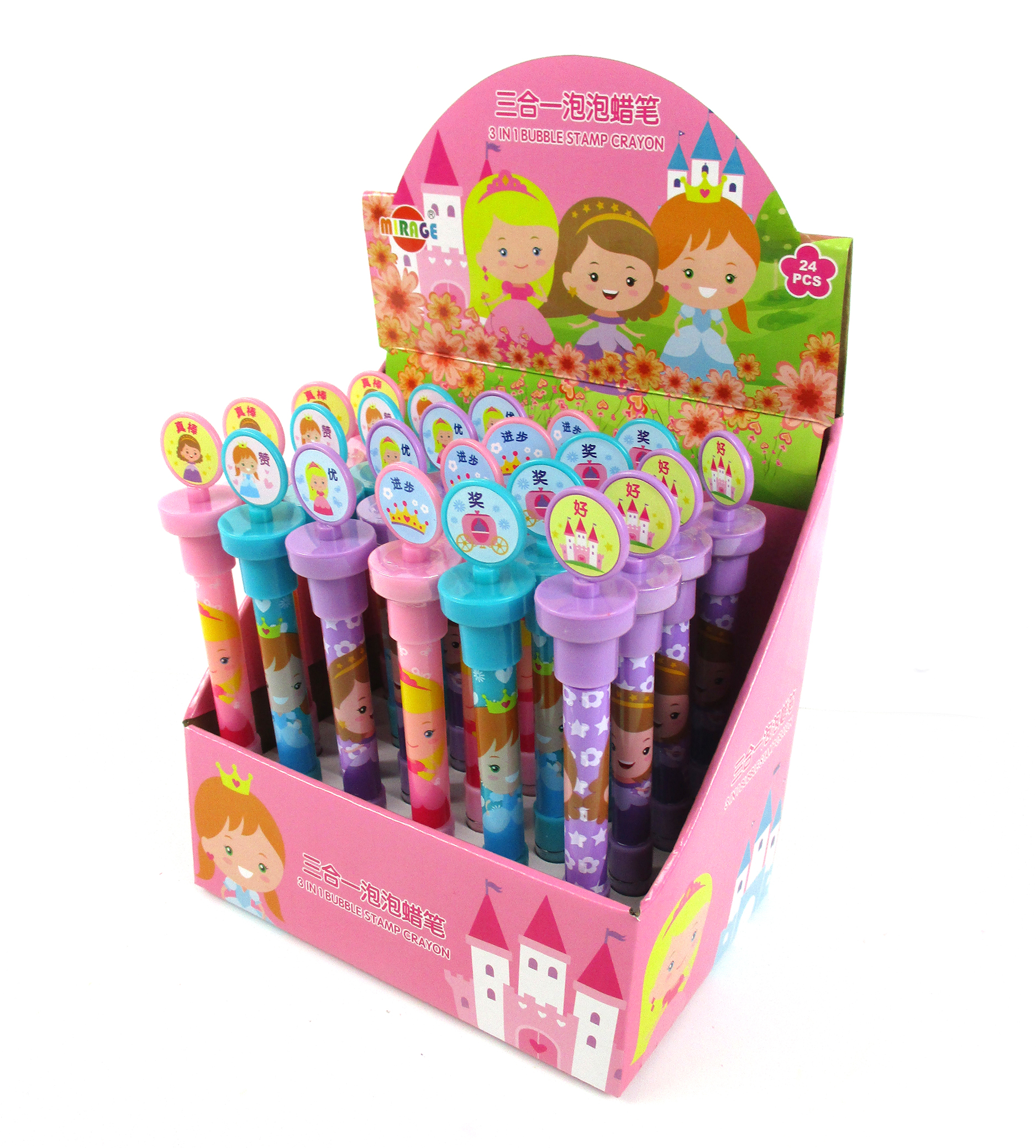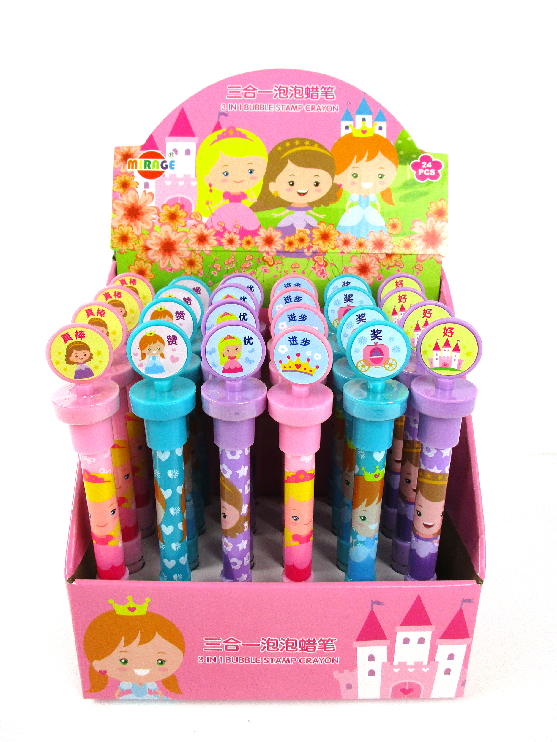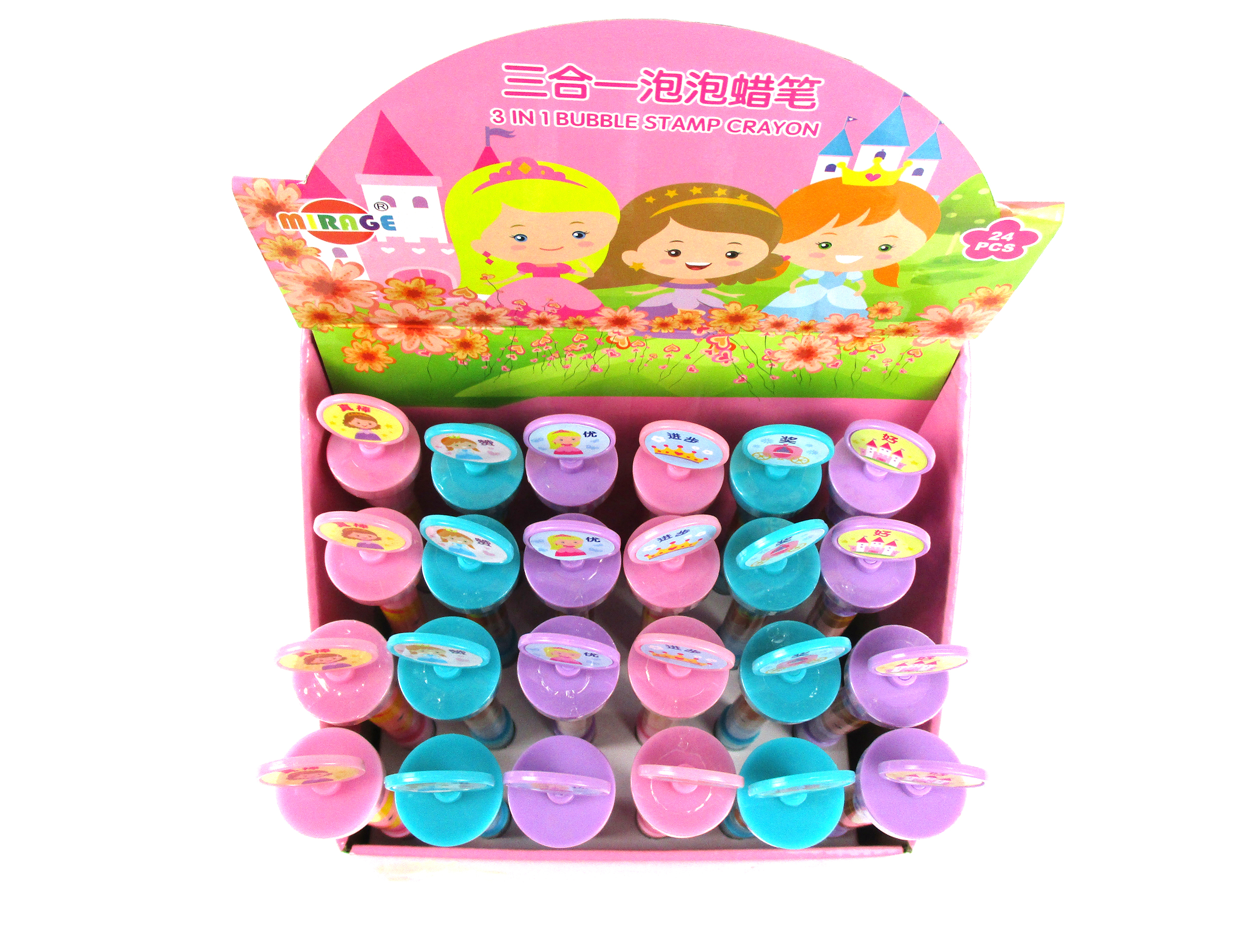 - It is a 3 in 1 coloring instrument that has a self-inking stamp, bubbles, and a crayon for coloring.