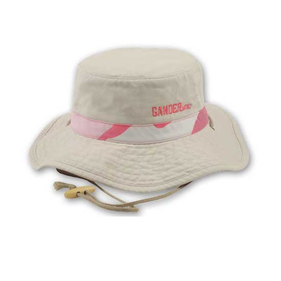 This bucket hat possesses a wide and downward-sloping brim. The durable structure makes it a perfect choice for outdoor activities. The hat is white in color with a pink strap to show your energy in summertime.