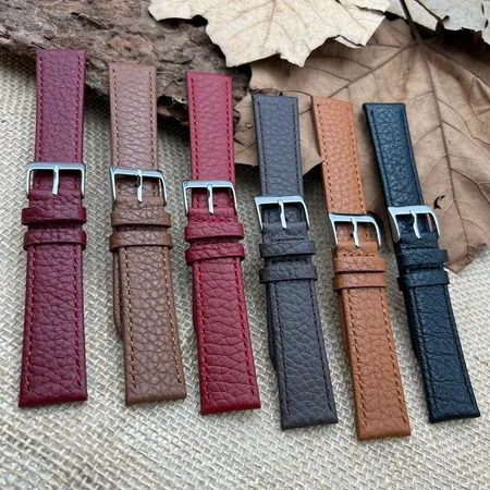 Remborded edge, pointed end, flat, Buffalo grain scrap genuine leather as top leather, tan color genuine leather as back lining