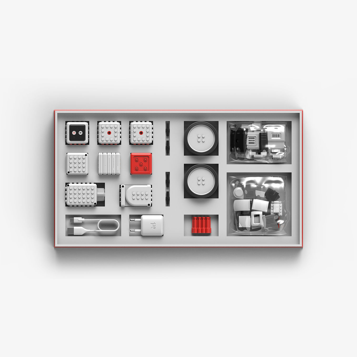 Window cube x 1, motor cube x 2, bridge x 5, lighting cube x 1, angle cube x 1, cannon cube x 1, cannon bombs x 10, nick character pack x 1, wiiy & cobi character pack x 1, wheel set x 4, charger cube x 1, user manual x 1, charger set x 1