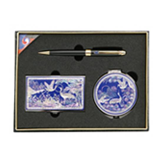 This is a Korean gift set decorated with mother-on-pearl patterns. These gifts are sophiscated and are decorated with the theme of nature. They show their craftsmanship with strong national feature.