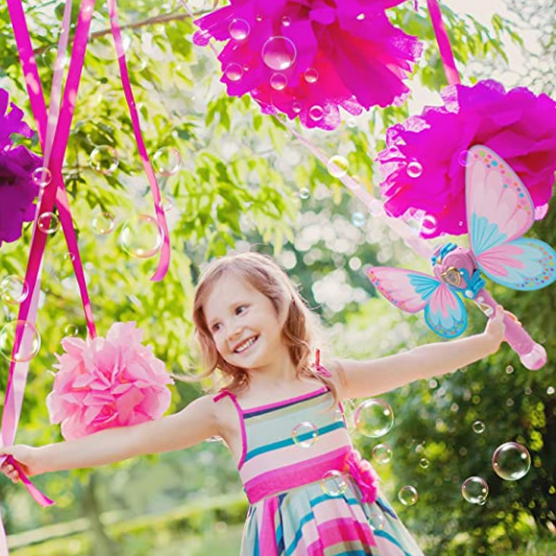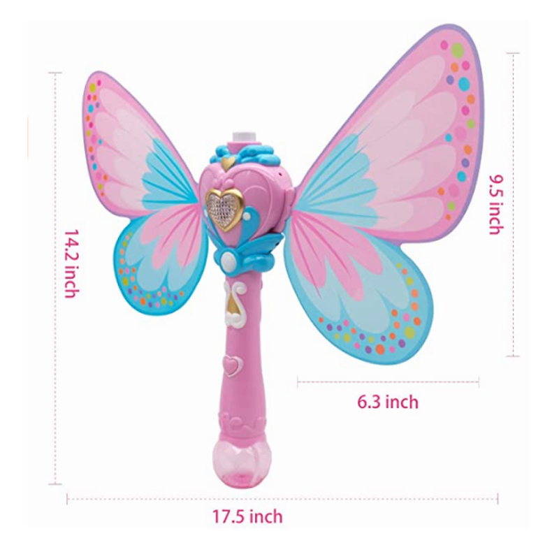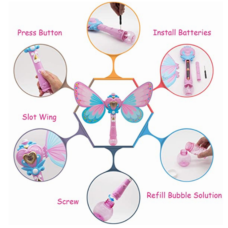 [ EASY TO ASSEMBLE AND LASTING BUBBLES OUTPUT ] Three AA 1.5V batteries are required for the bubble machine. Thousands of bubbles will come out per minute as the release button is pressed. The wings are also detachable. When the wings are installed, it is an adorable butterfly; when they are removed, it is a fashionable magic wand. Perfect bubble machine for girls.