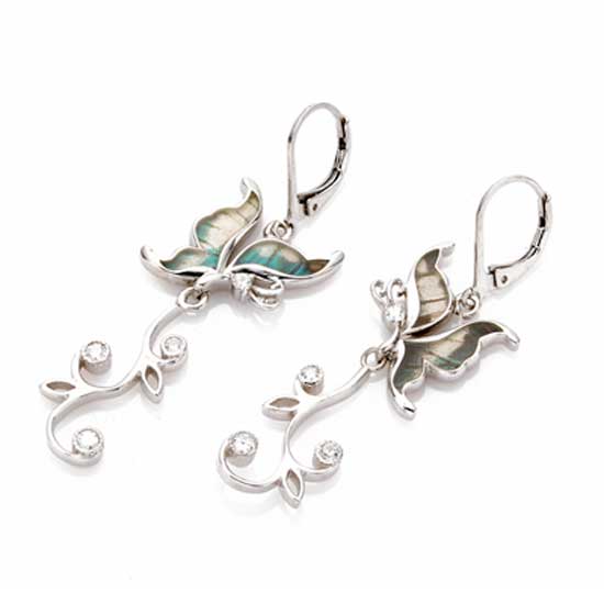 Highlighted here is a pair of earrings that comes in a butterfly shape. The butterfly earrings feature a silver setting and are accented with glittering crystals for a refined touch. This pair of silver earrings is easy to mix and match.