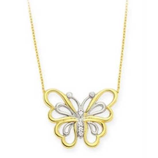 This is a necklace featuring a butterfly pendant and an exquisite chain. It comes with a polished surface and is adorned with shimmering cubic zirconia stones on the pendant. This chic necklace makes a great addition to your jewelry collection.