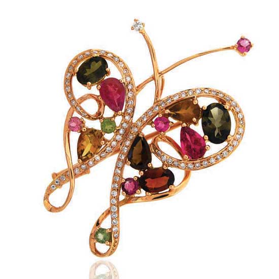 Displayed is a butterfly pendant finely crafted with attention to every detail. The butterfly comes with wings set with colorful, shaped tourmalines. The polished rose gold frame is completed with the adornment of icy diamonds.